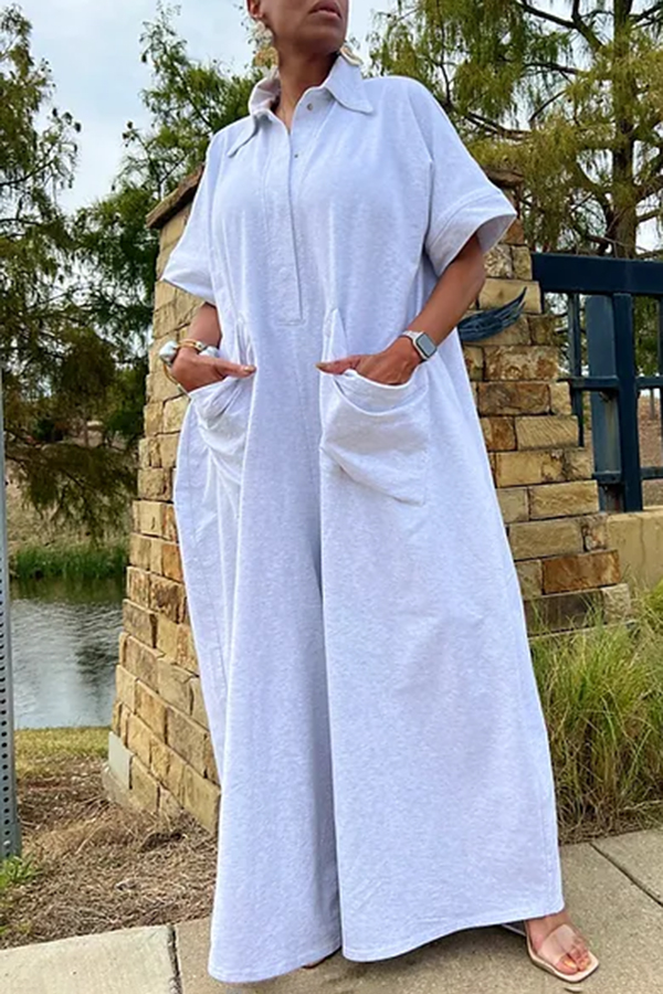 Solid Color Fold-Over Collar Single-Breasted Short-Sleeved Jumpsuit
