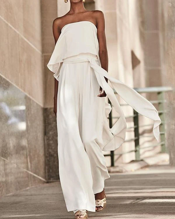 Boat Neck Belted Short Sleeve Dressy Jumpsuits For Women