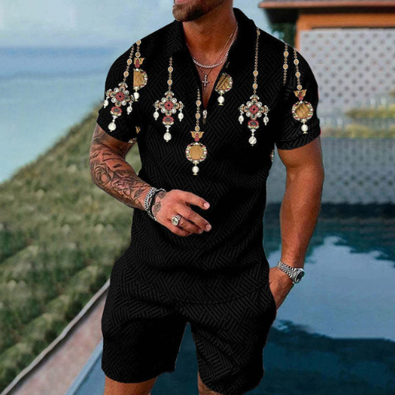 Causal Gemstone Pendant Pattern Print Short Sleeve Polo Shirt And Shorts Co-Ord