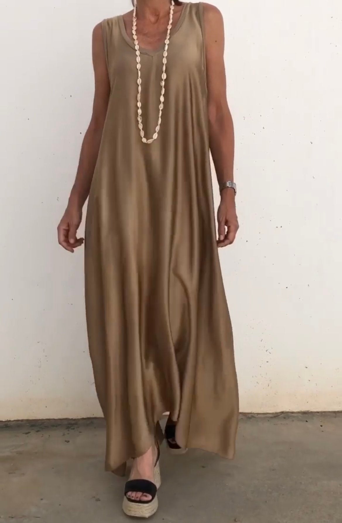 Women's Casual Solid Color V Neck Sleeveless Satin Dress