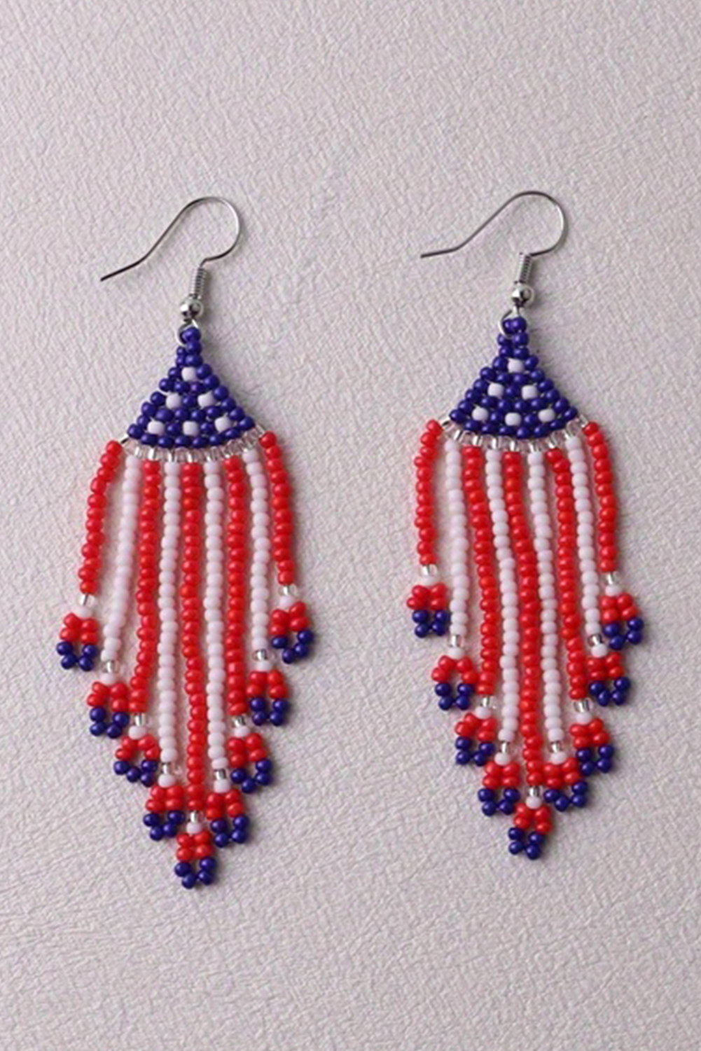 Fiery Red American Flag Beaded Fringed Hook Earrings