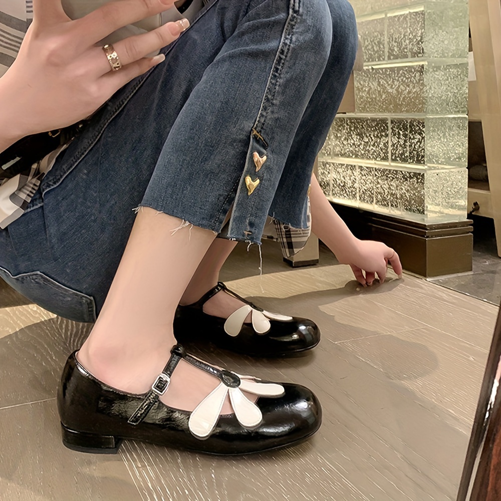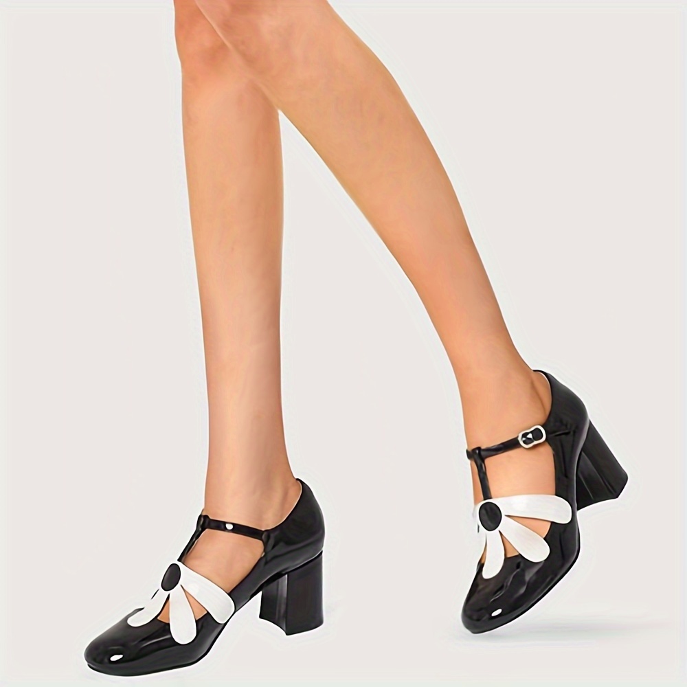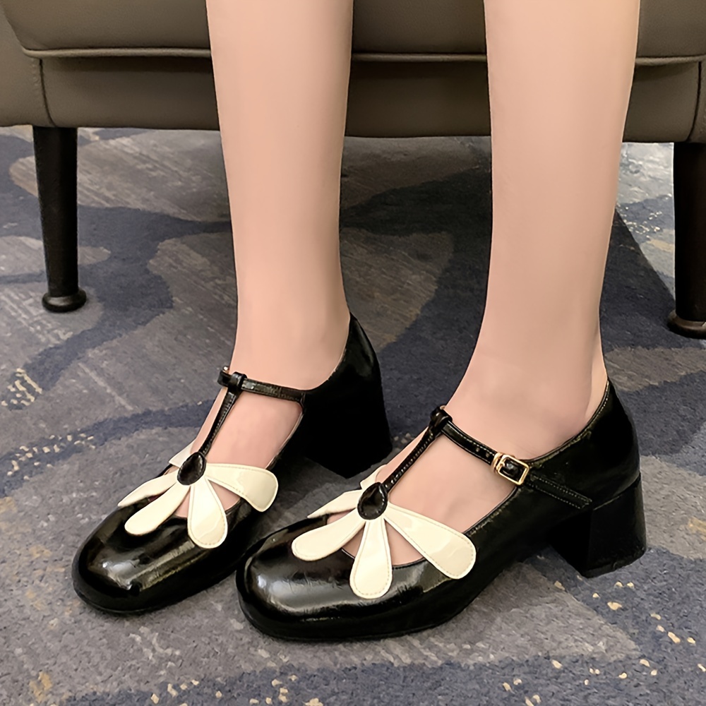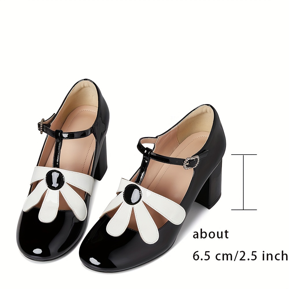 Women's Chunky Mid Heels, Elegant Flower T-strap Pumps, All-Match Ladies Dress Shoes