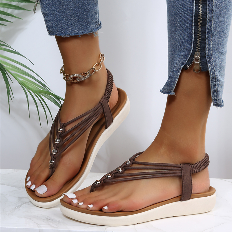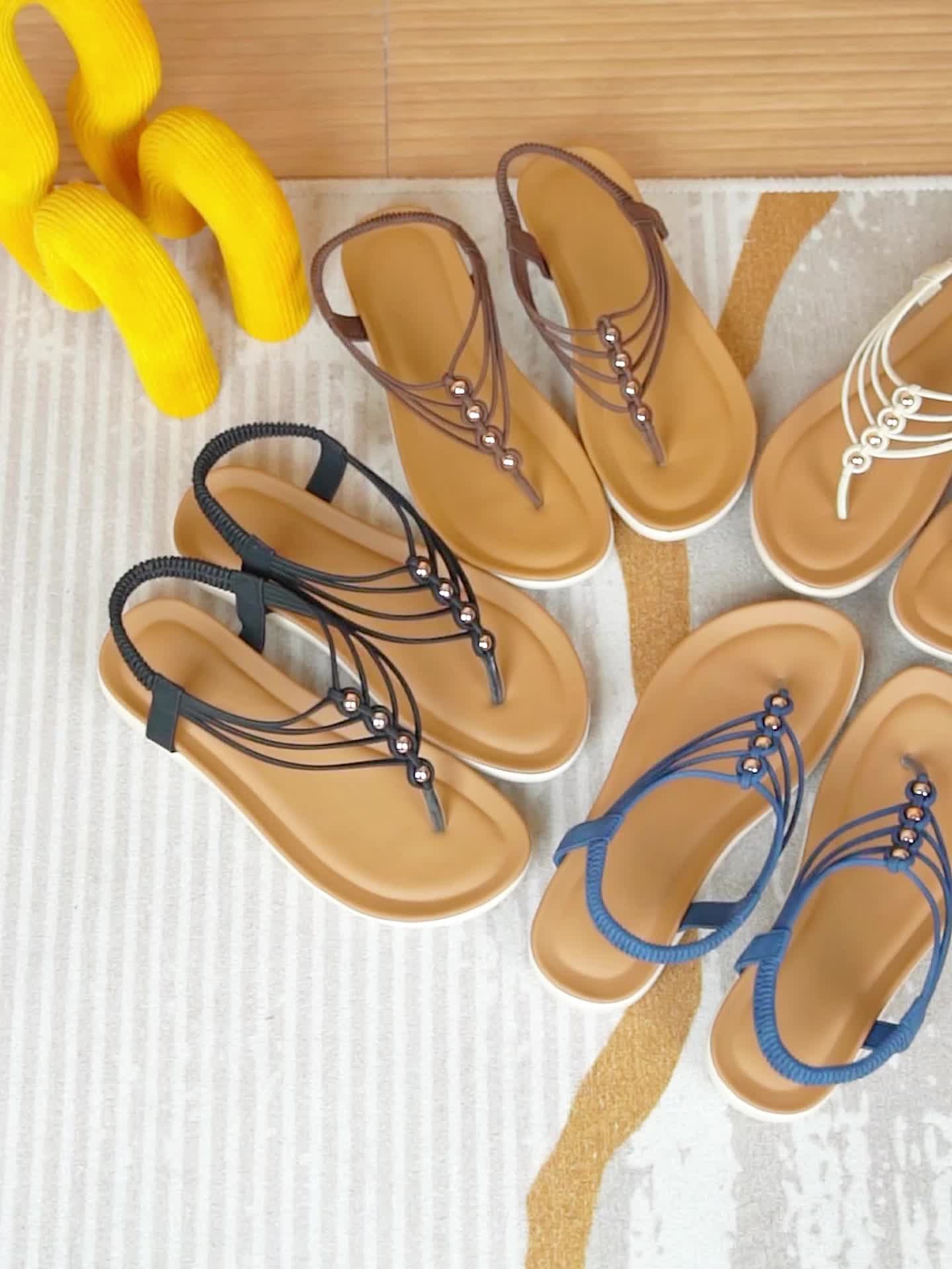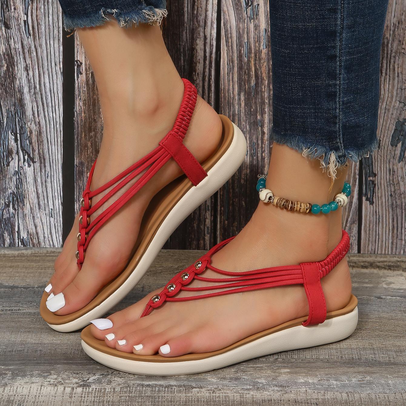 Women's Flat Thong Sandals, Boho Style Beads Elastic Strap Slip On Shoes, Casual Beach Sandals