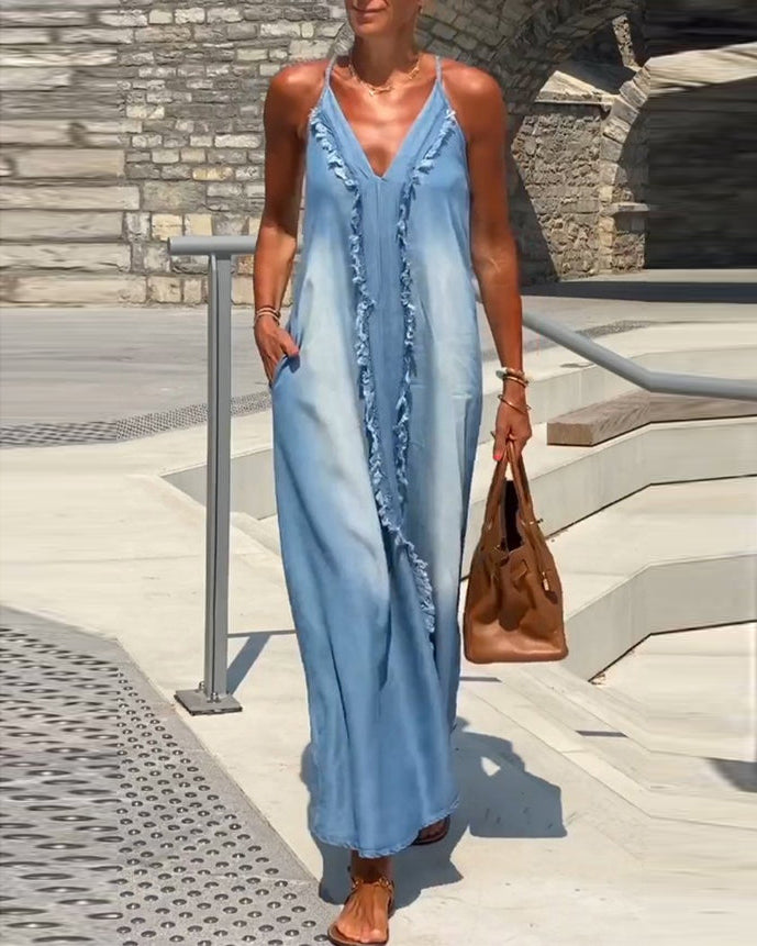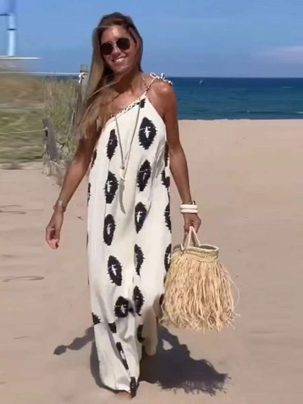 Elegant Solid Sloping Shoulders Cotton Linen Sleeveless Long Dress