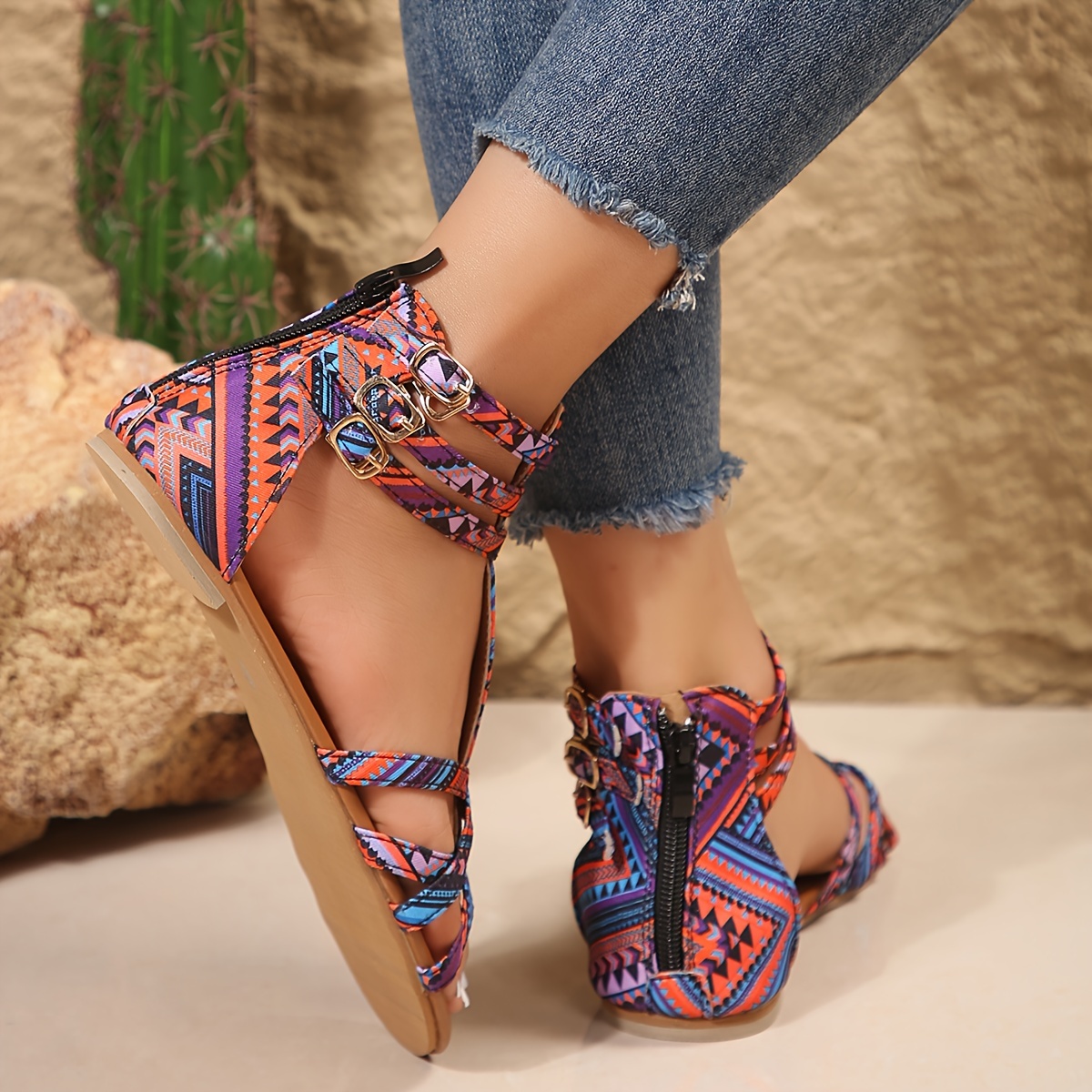 Women's Geometric Pattern Flat Sandals, Casual Open Toe Summer Shoes, Lightweight Back Zipper Sandals