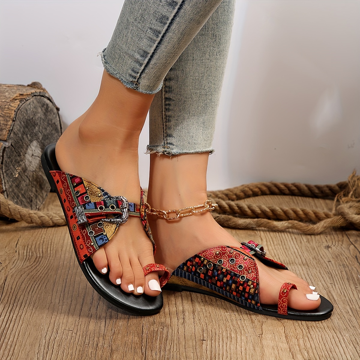 Women's Toe Loop Flat Slides, Fashion Buckle Strap Canvas Shoes, All-Match Outdoor Summer Slide Sandals