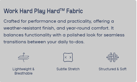 The Work Hard Play Hard Fabric is wind and water-resistant for all-season wear. It feels light but wears durably to handle the demands of your day.