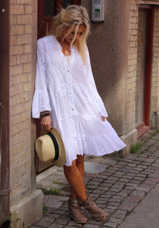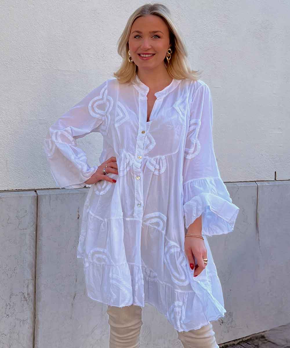 Flock is a lovely ruffled tunic with a lot of width from Chica London. The tunic has a rounded, split neckline with buttons, long wide sleeves with ruffles and a ruffle at the bottom and decorated with hearts. The tunic comes in size one size and is generous in size.