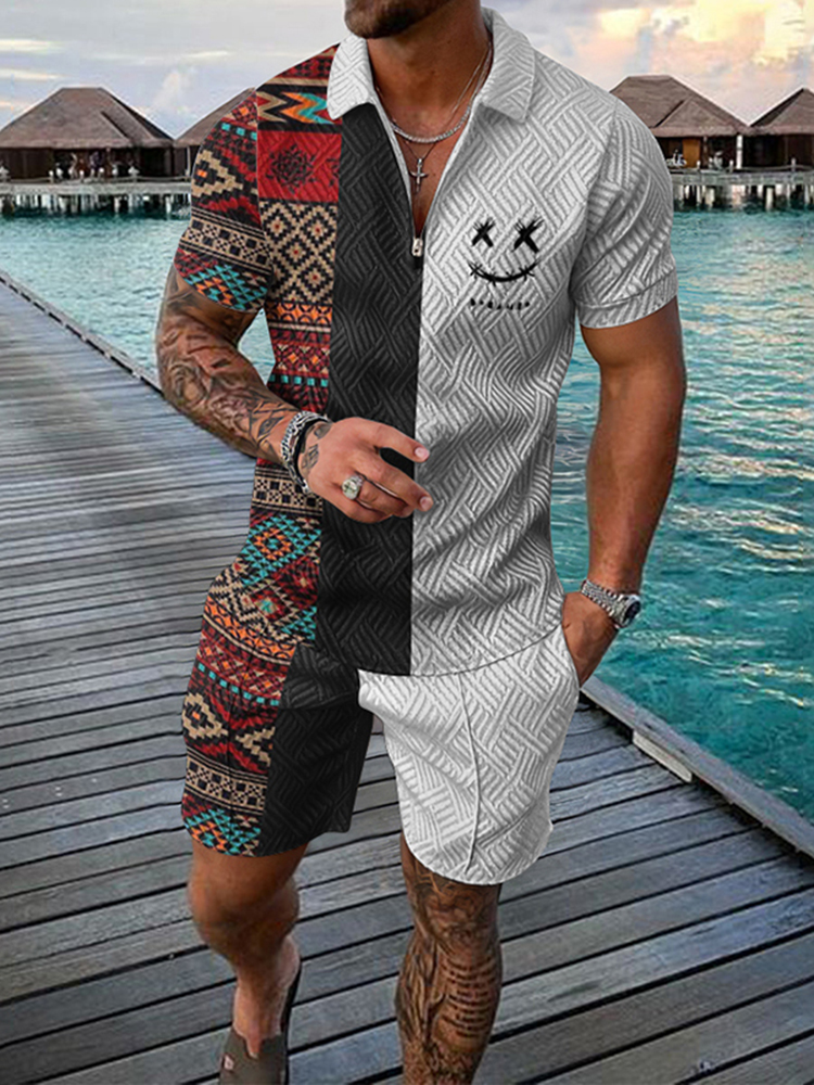 Two Tone Ethnic Smiley Face Short Sleeve Polo Shirt And Shorts Co-Ord