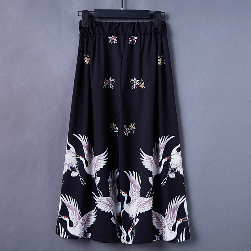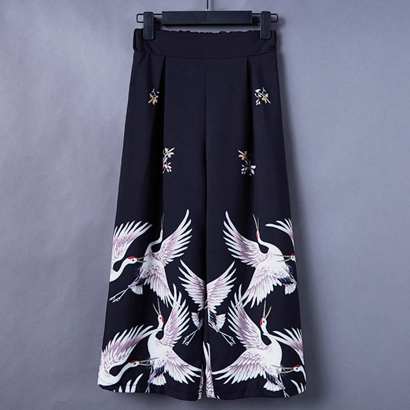 Vintage Crane Print Wide Leg Casual Pants