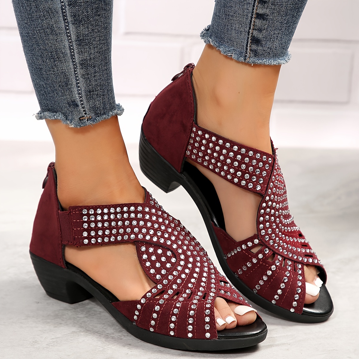 Women's Rhinestone Pattern Sandals, Peep Toe Back Zipper Chunky Heel Side Cut Out Wedge Shoes, Versatile Glitter Comfy Shoes