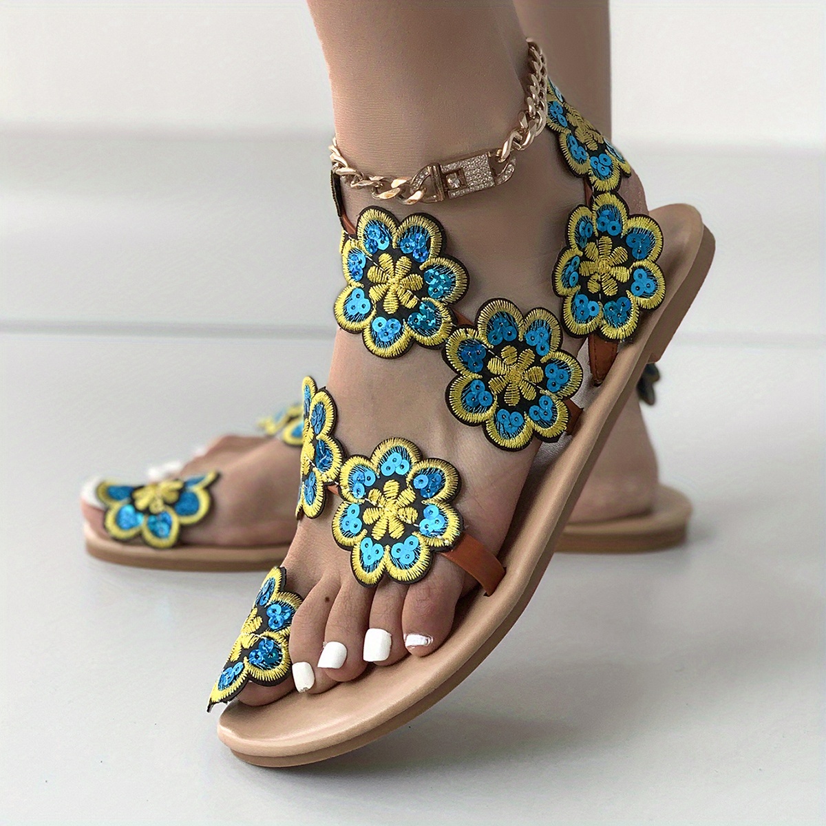Women's Colorful Flat Samdals, Boho Style Toe Loop Slip On Shoes, Summer Beach Sandals