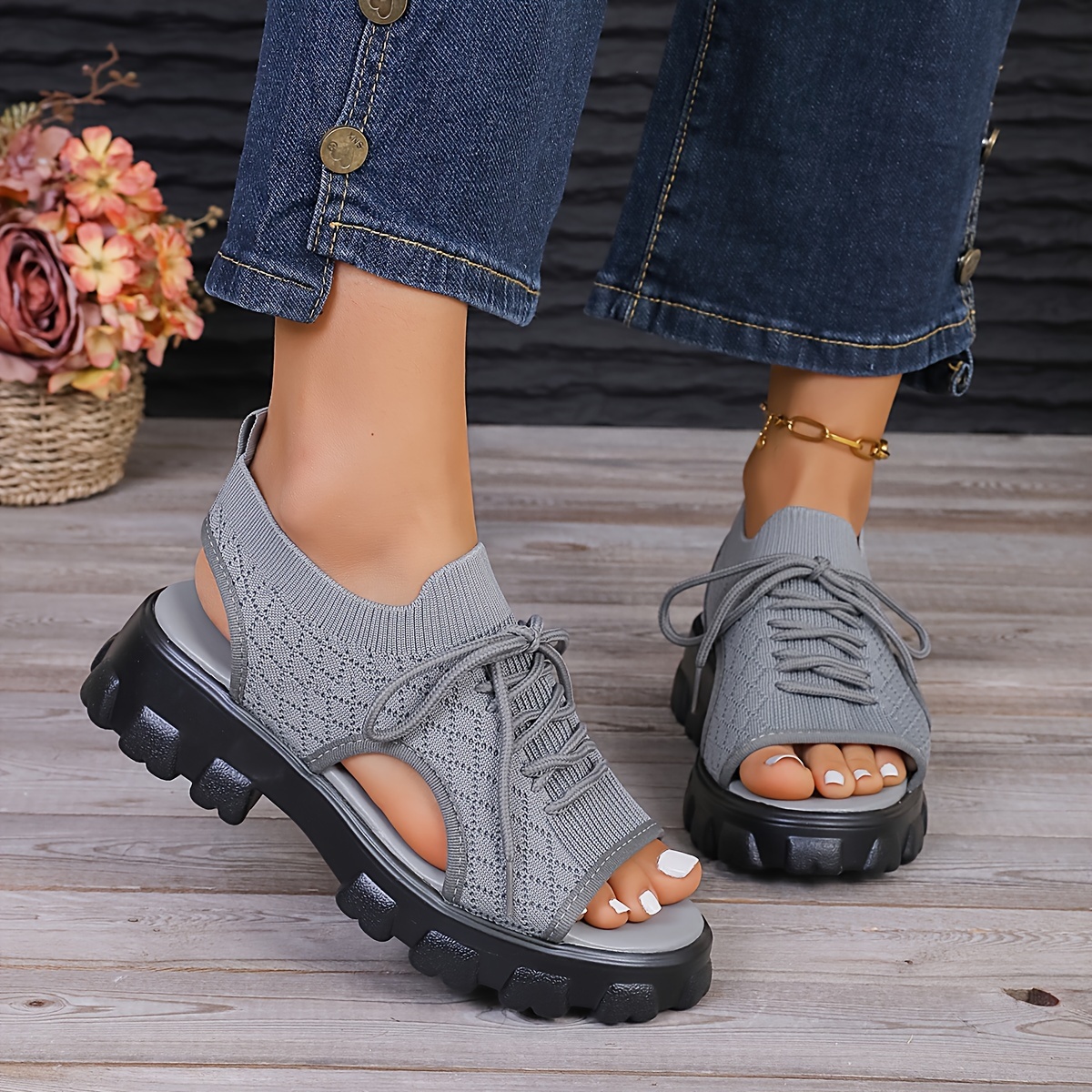 Women's Knitted Platform Sandals, Peep Toe Lace Up Cut-out Summer Shoes, Casual Breathable Outdoor Sandals