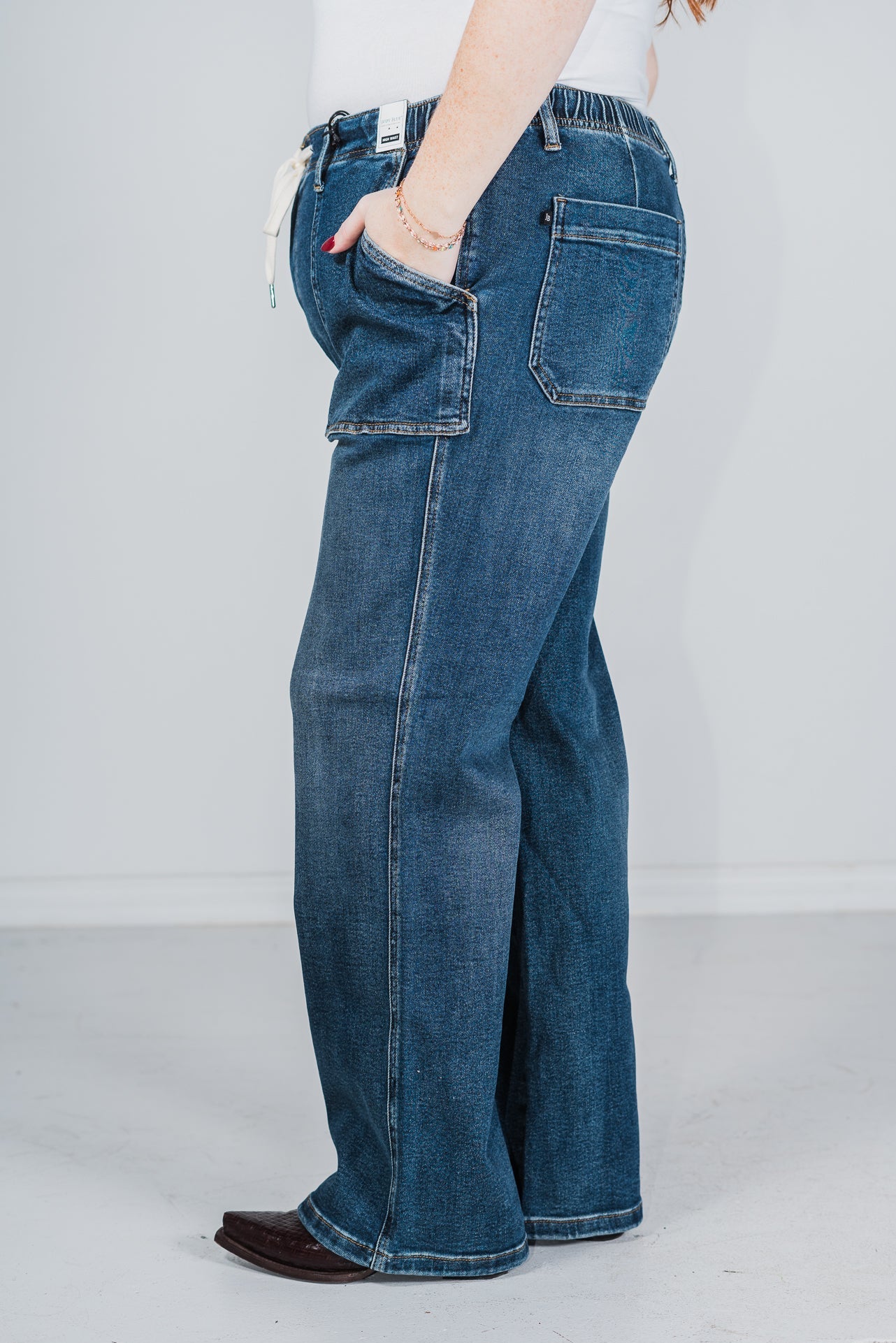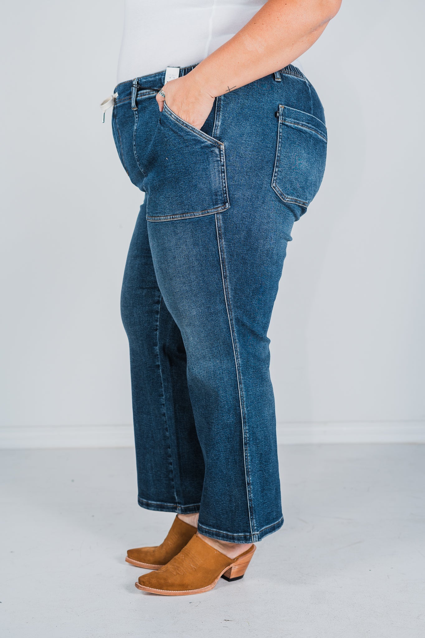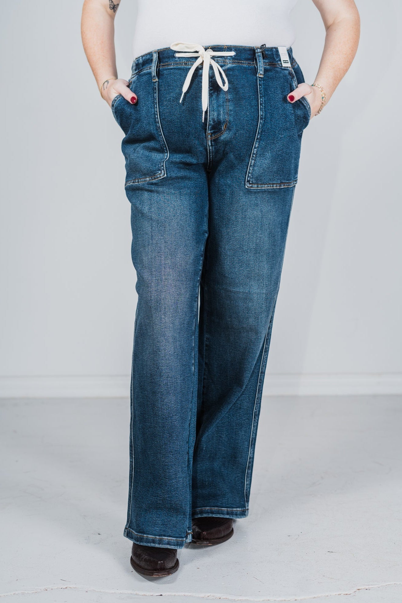 With a flattering fit and functional drawstring, these jeans will hug your curves in all the right places while also providing the perfect mix of style and comfort. Whether you're running errands, lounging at home, or hitting the town, these jeans are the perfect choice for any occasion.