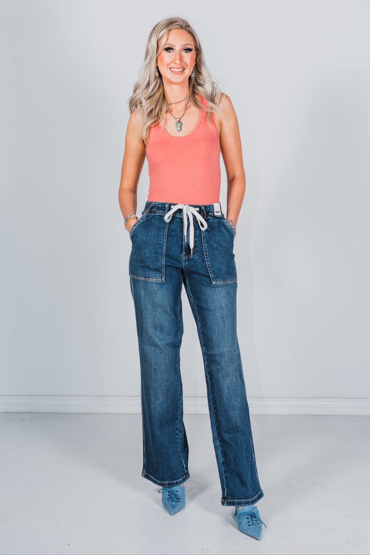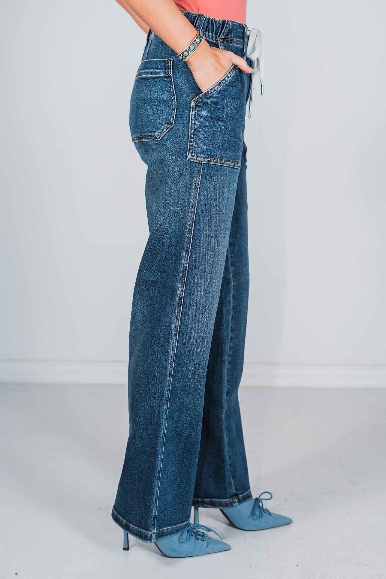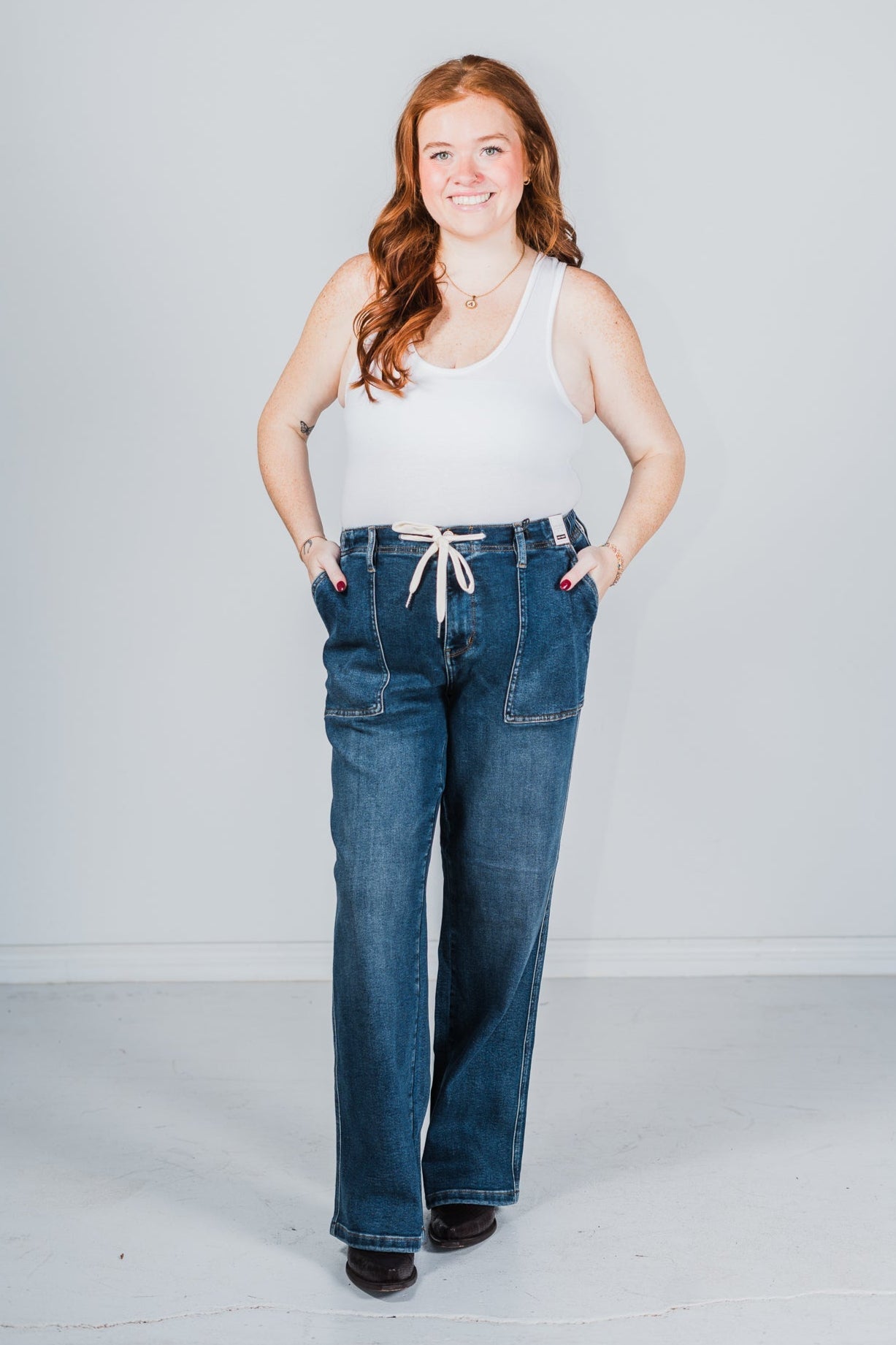 With a flattering fit and functional drawstring, these jeans will hug your curves in all the right places while also providing the perfect mix of style and comfort. Whether you're running errands, lounging at home, or hitting the town, these jeans are the perfect choice for any occasion.