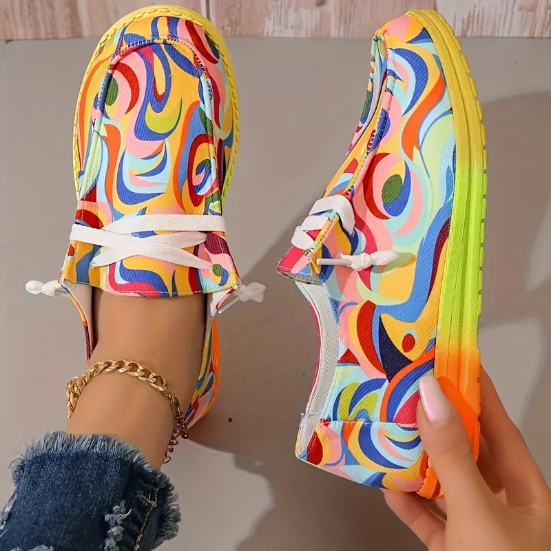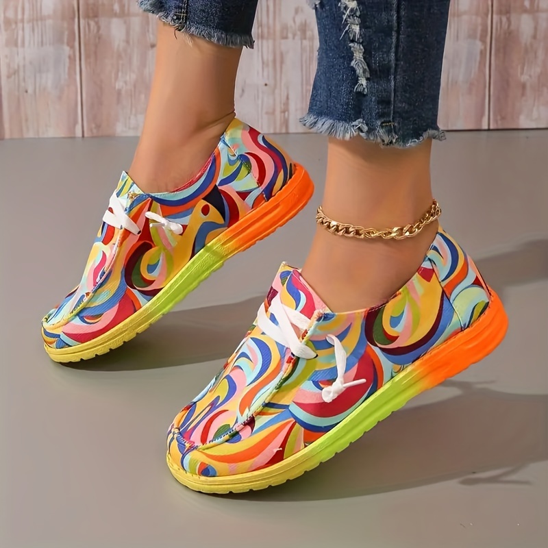 Carnaval Women's Colorful Geometric Graphic Boat Shoes, Round Toe Lace Up Flat Shoes, Versatile Casual Walking Shoes