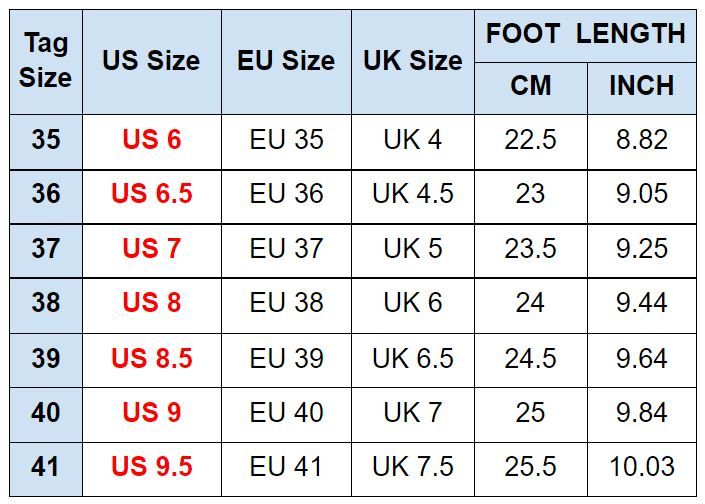 NOTE: PLease, refer only to your foot measurements to choose US size. It may differ from your normal size.