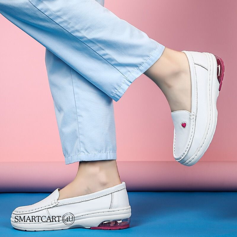 These slip on nursing shoes is made of high quality full grain stain resistant leather resists moisture very well and easy to care of.