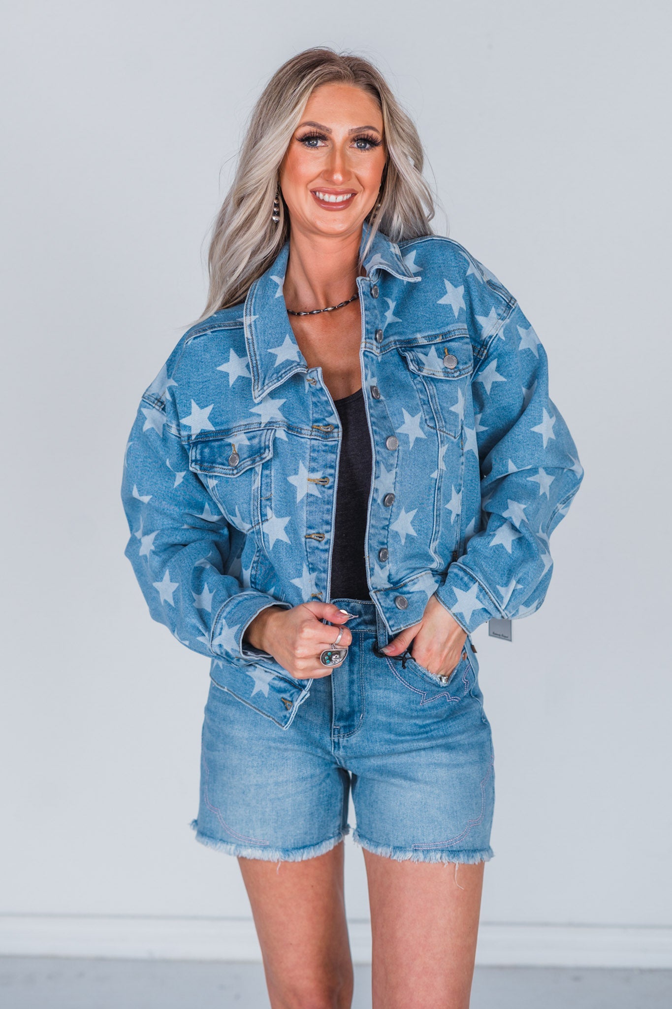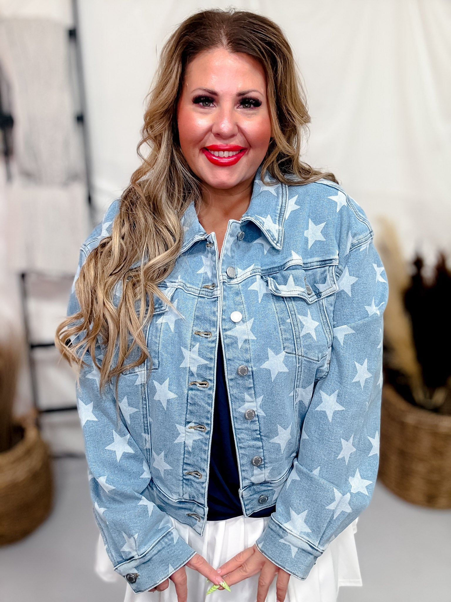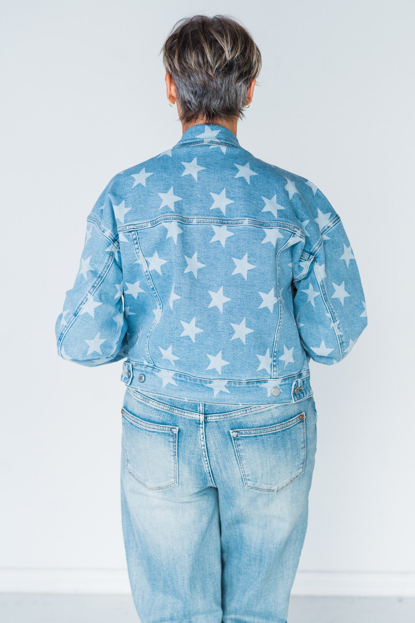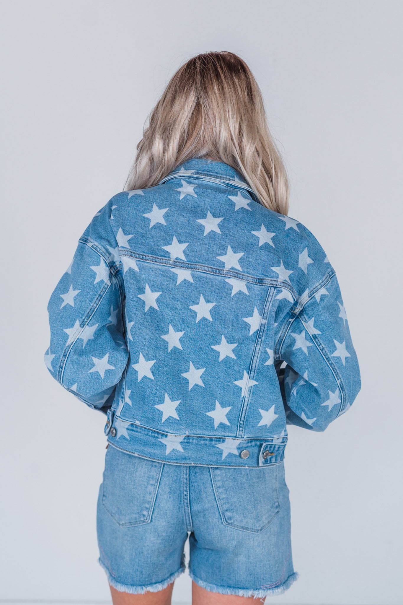 Show off your American pride with this fashionable jacket. Perfect for 4th of July celebrations or any summer outing, it's sure to be a hit with your friends. Made with high-quality denim and featuring a fun star print, it's a stylish addition to your wardrobe. Don't miss out on this must-have piece for any patriotic occasion!