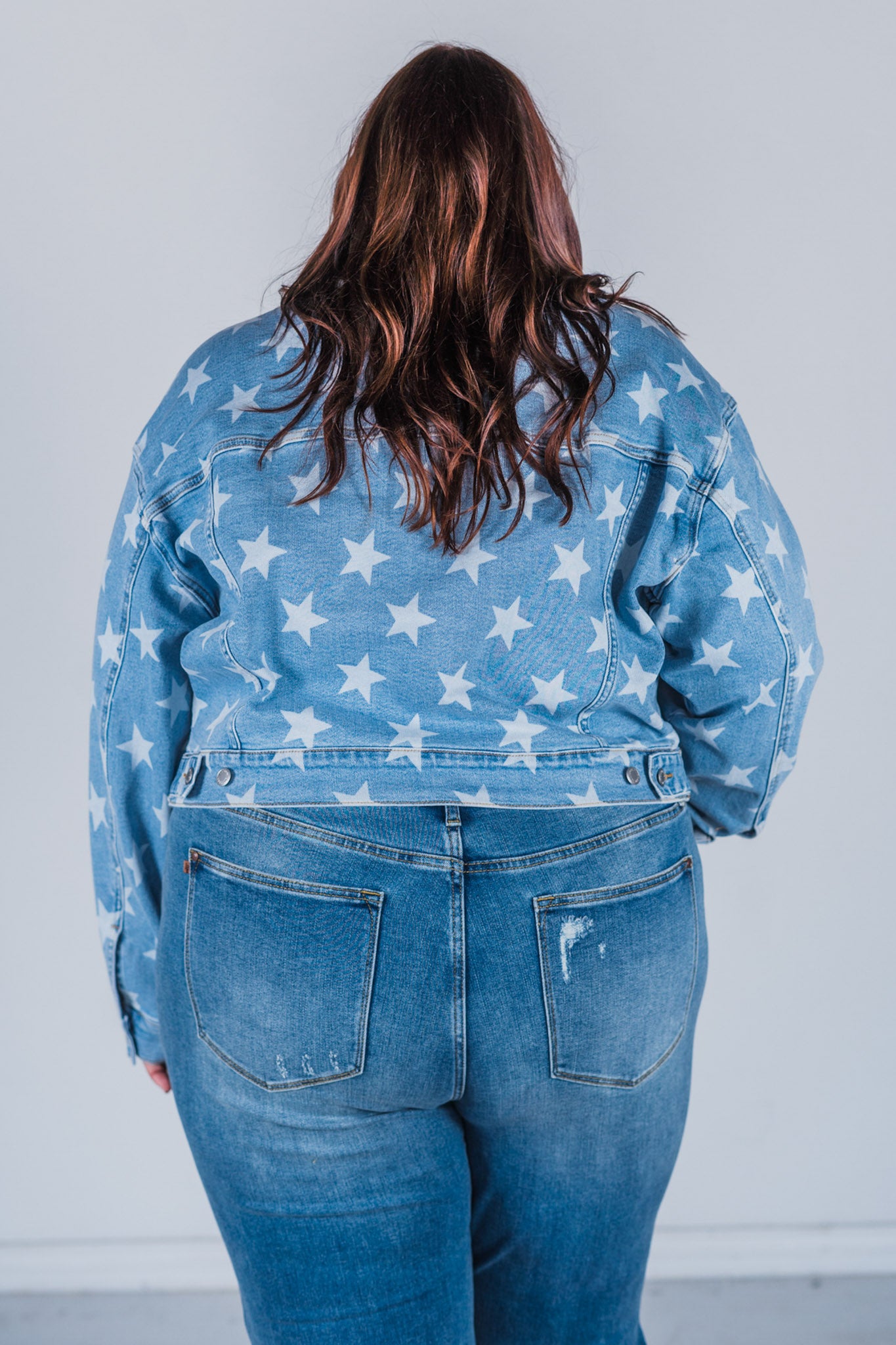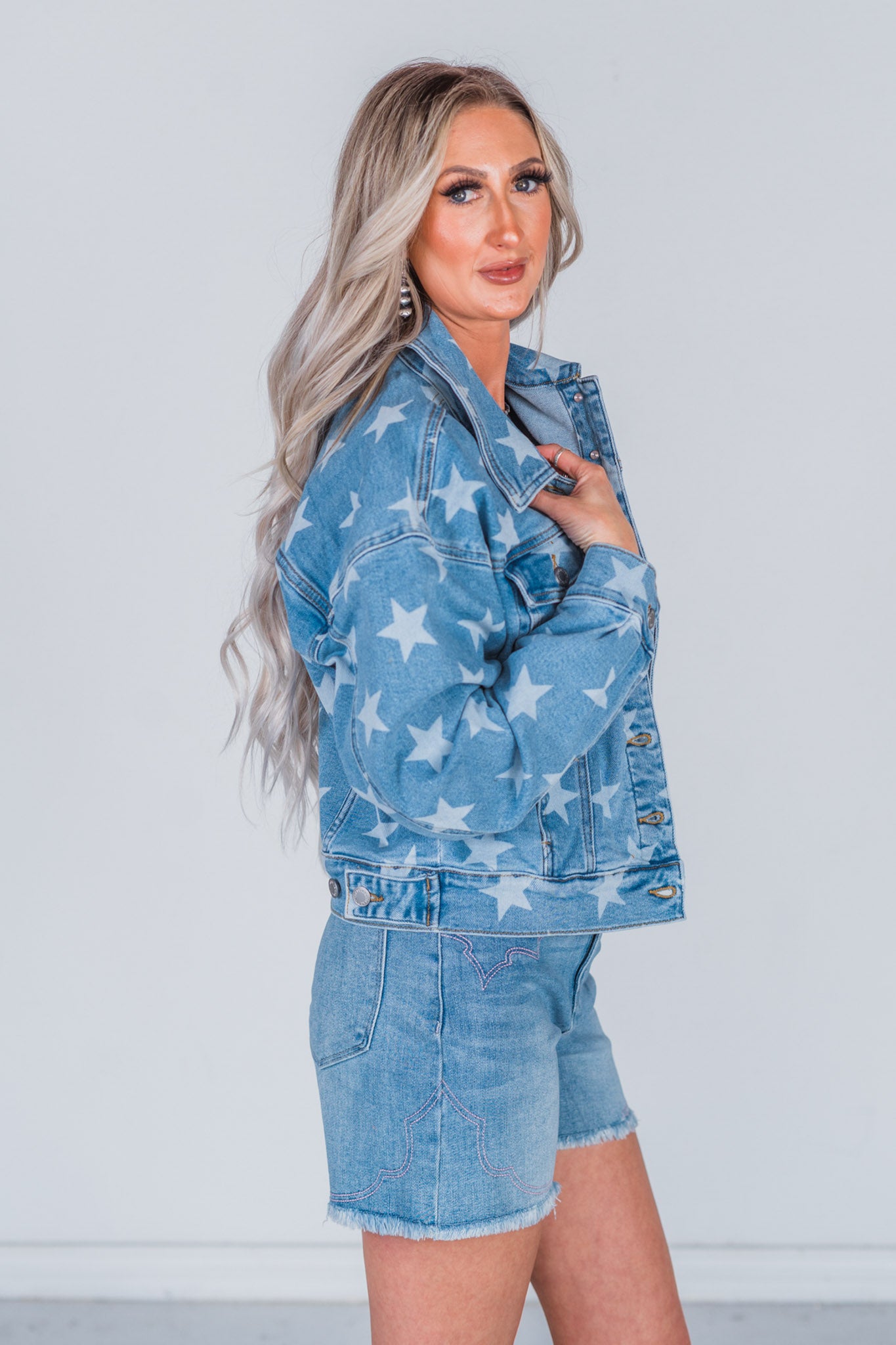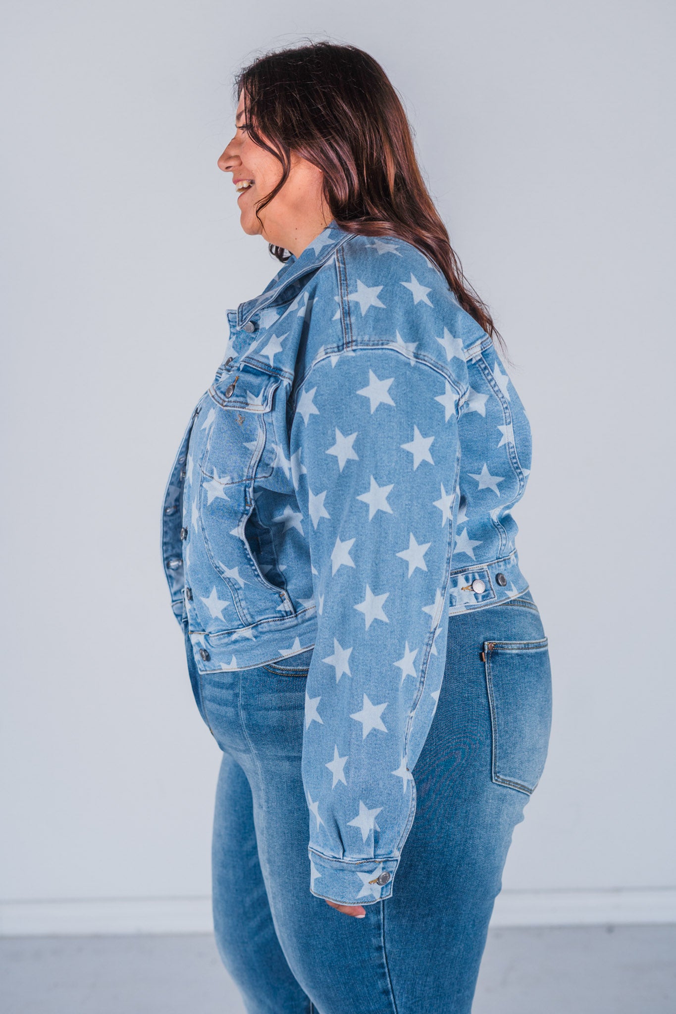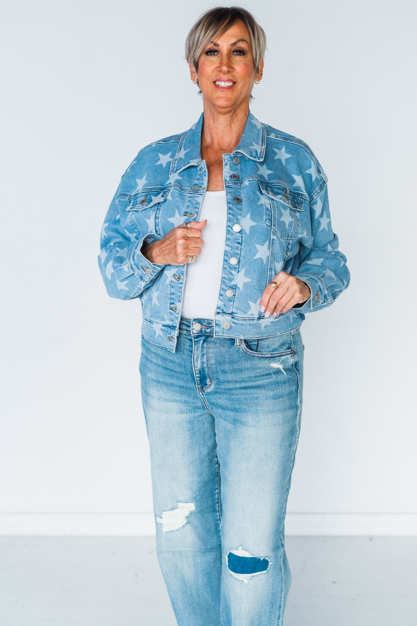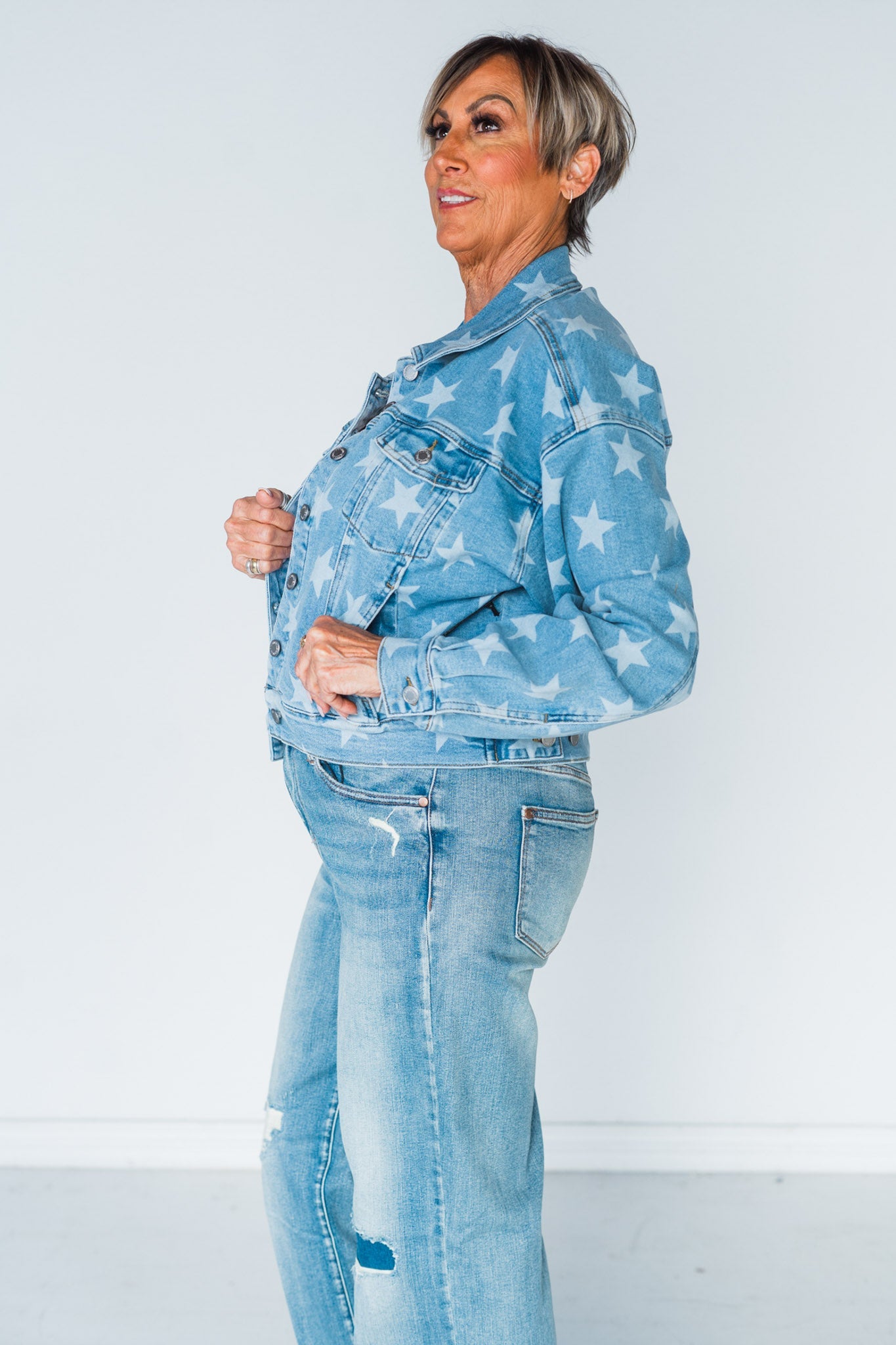 Show off your American pride with this fashionable jacket. Perfect for 4th of July celebrations or any summer outing, it's sure to be a hit with your friends. Made with high-quality denim and featuring a fun star print, it's a stylish addition to your wardrobe. Don't miss out on this must-have piece for any patriotic occasion!