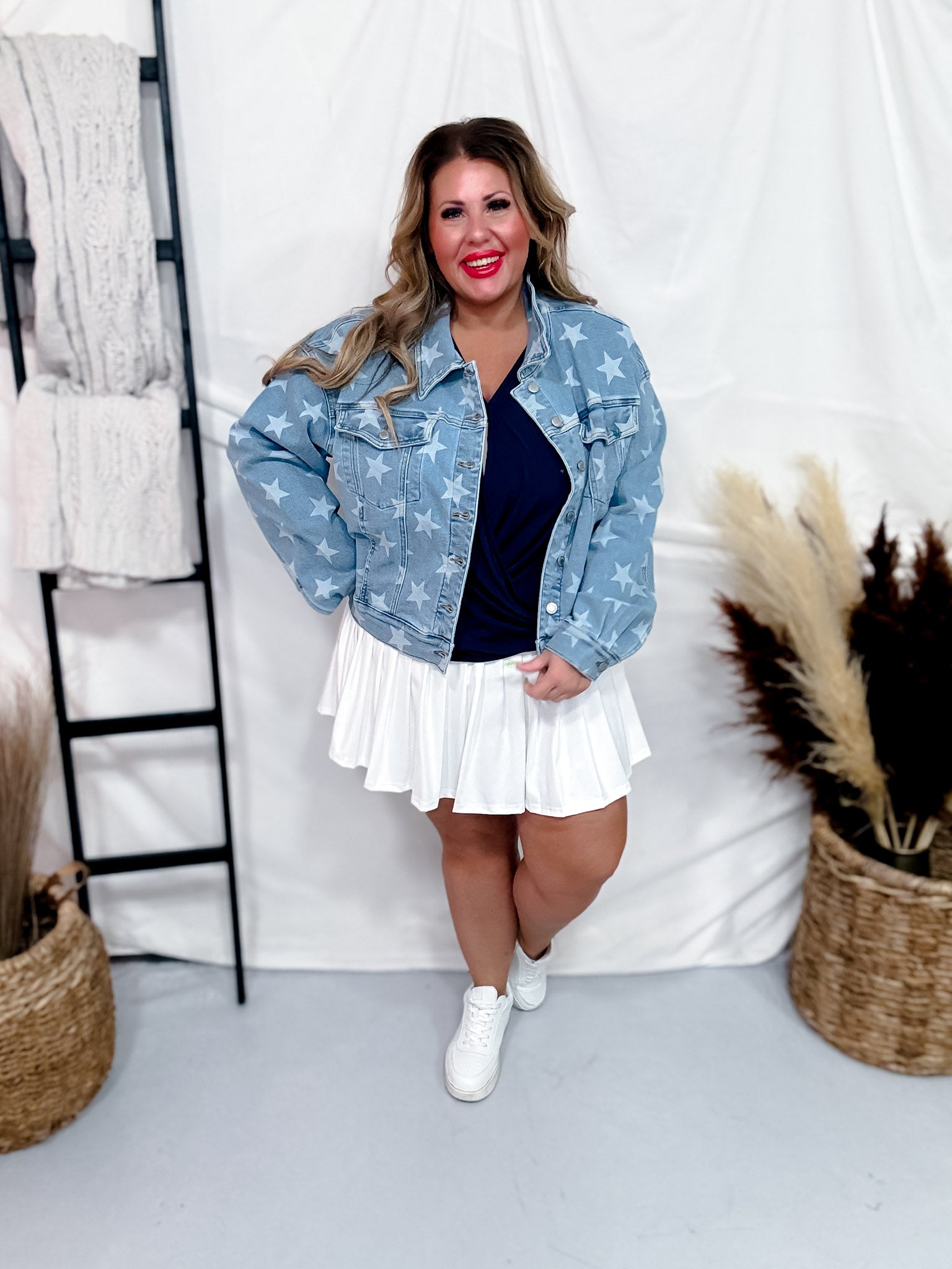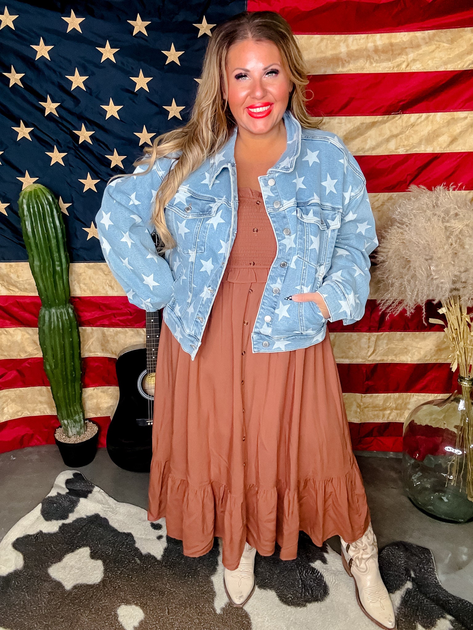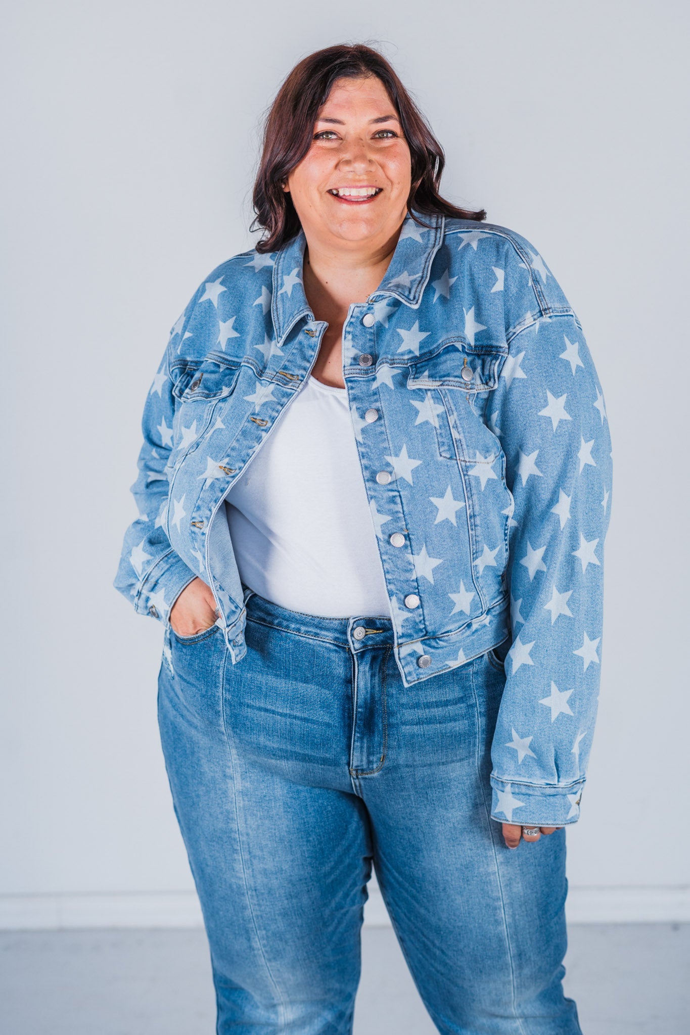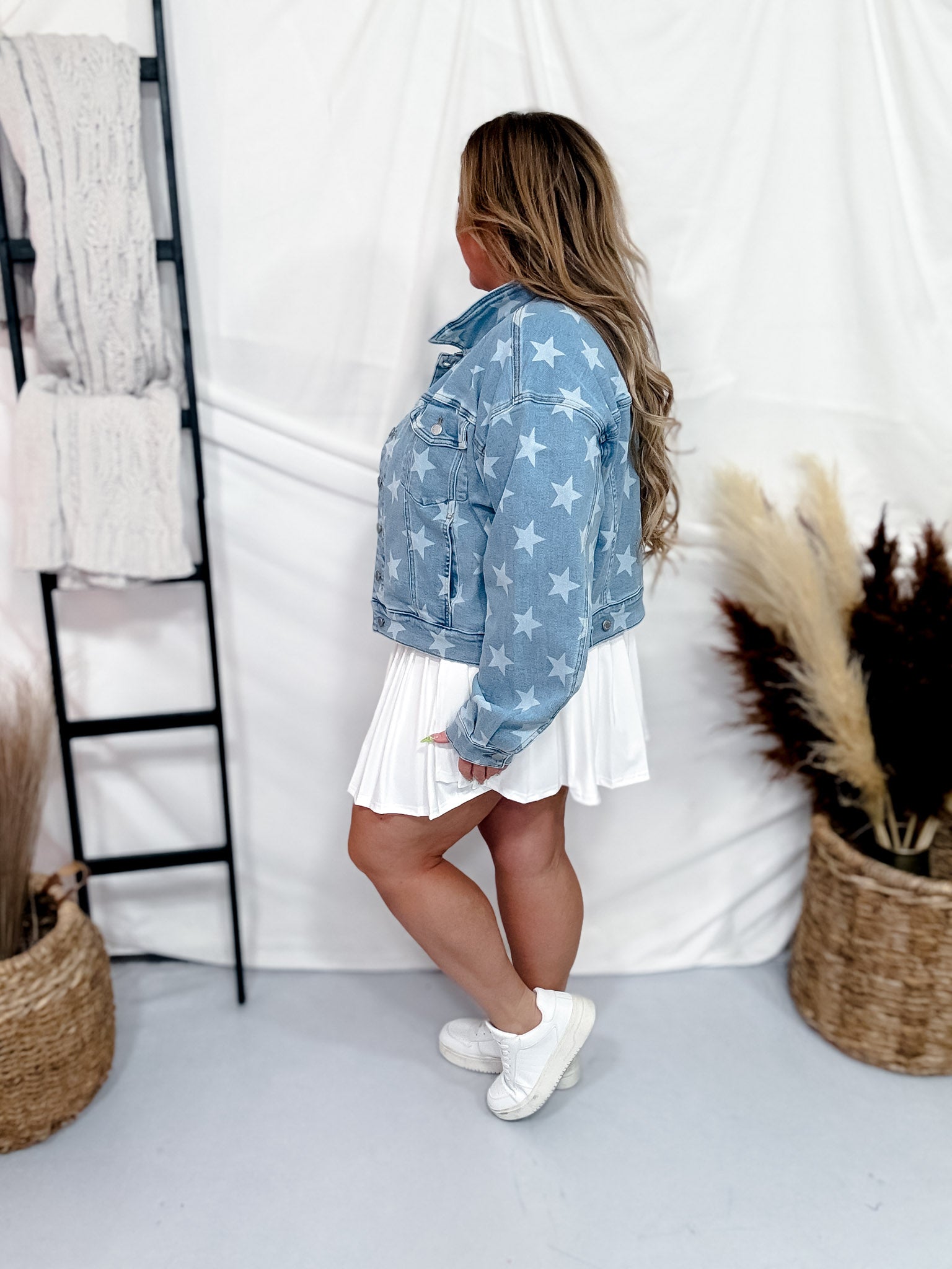 Show off your American pride with this fashionable jacket. Perfect for 4th of July celebrations or any summer outing, it's sure to be a hit with your friends. Made with high-quality denim and featuring a fun star print, it's a stylish addition to your wardrobe. Don't miss out on this must-have piece for any patriotic occasion!
