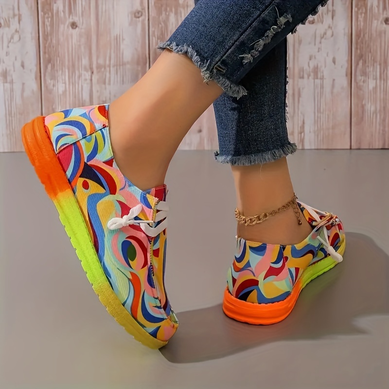 Carnaval Women's Colorful Geometric Graphic Boat Shoes, Round Toe Lace Up Flat Shoes, Versatile Casual Walking Shoes
