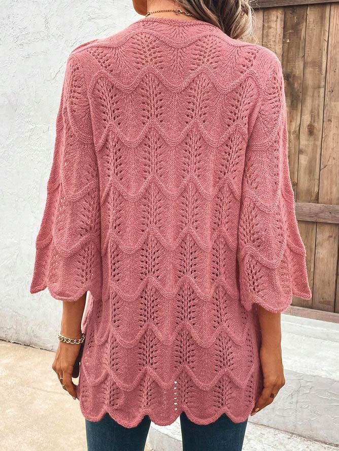 Casual Scallop Trim Pointelle Knit Open Front Cardigan