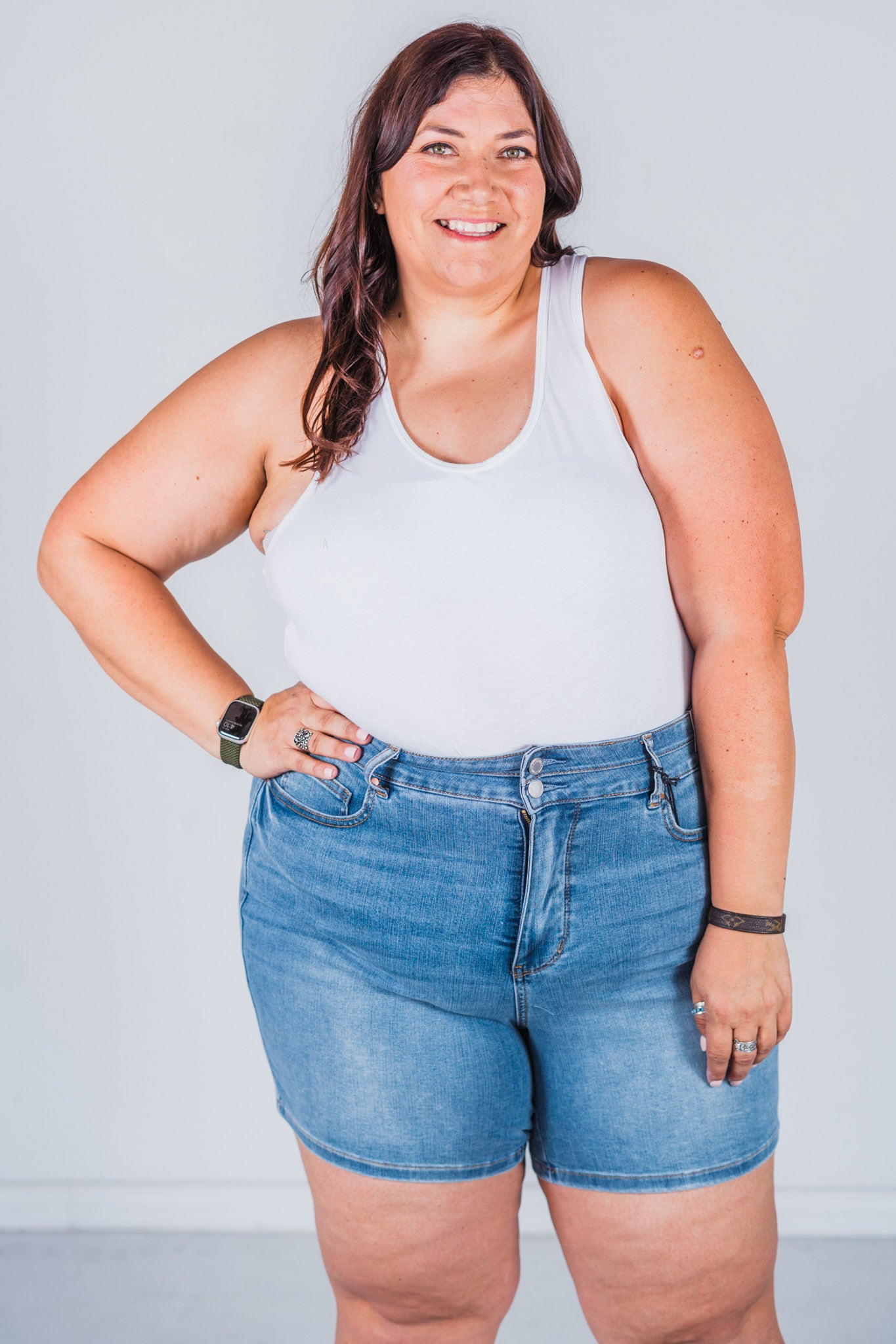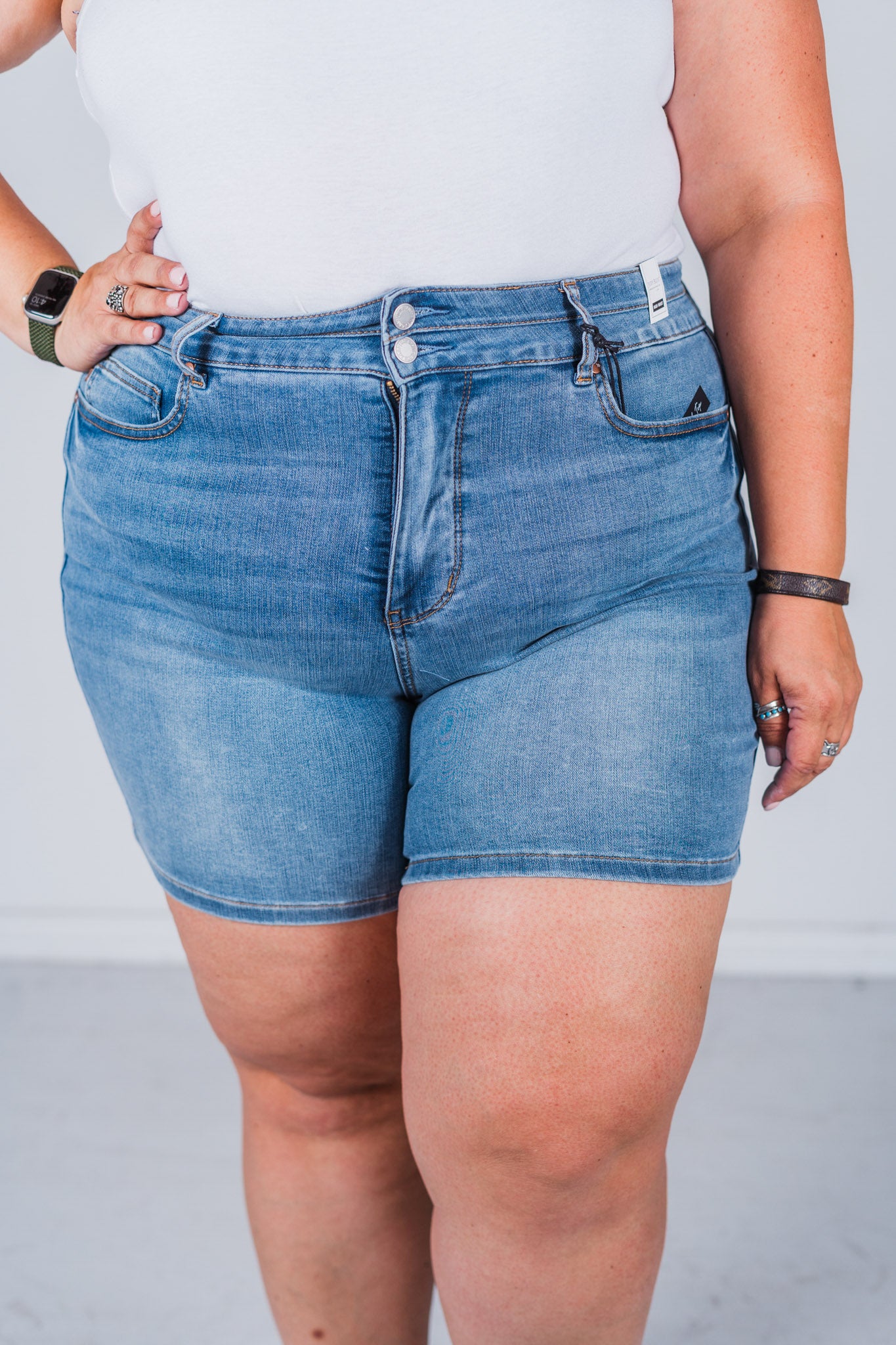 Enjoy a flattering fit and comfortable wear with our Judy Blue Double Waistband Tummy Control Denim Shorts. These shorts feature a high waist and double waistband for added tummy control, while the mid wash denim adds a touch of style. Perfect for everyday wear, these shorts are sure to become a staple in your wardrobe.