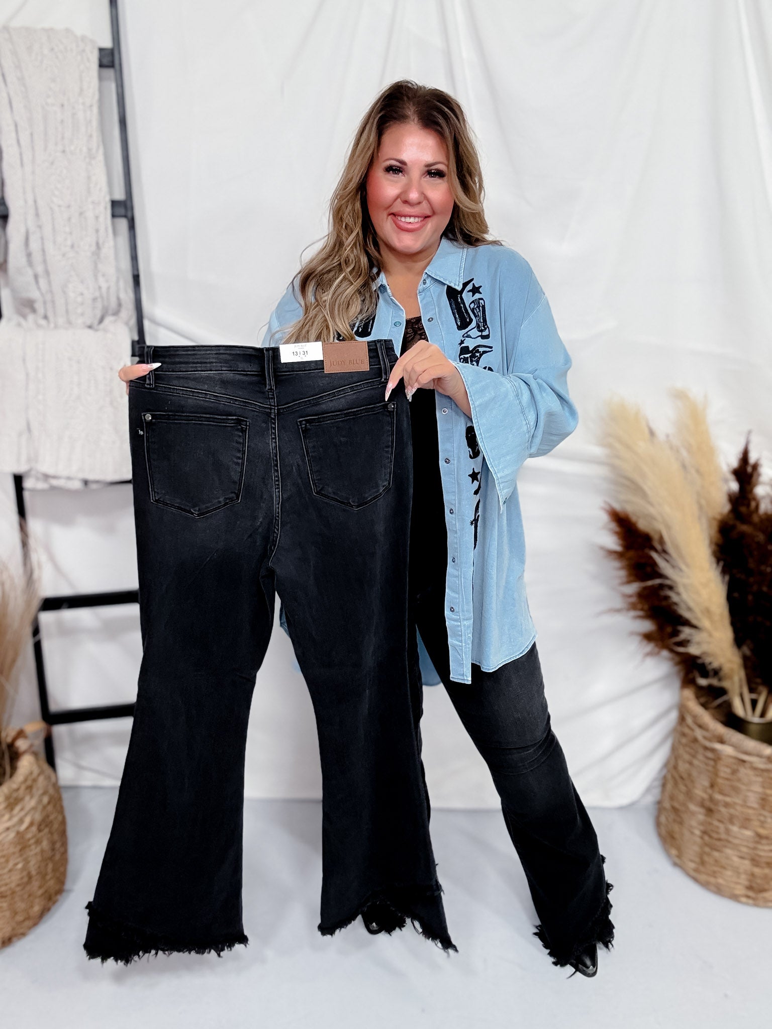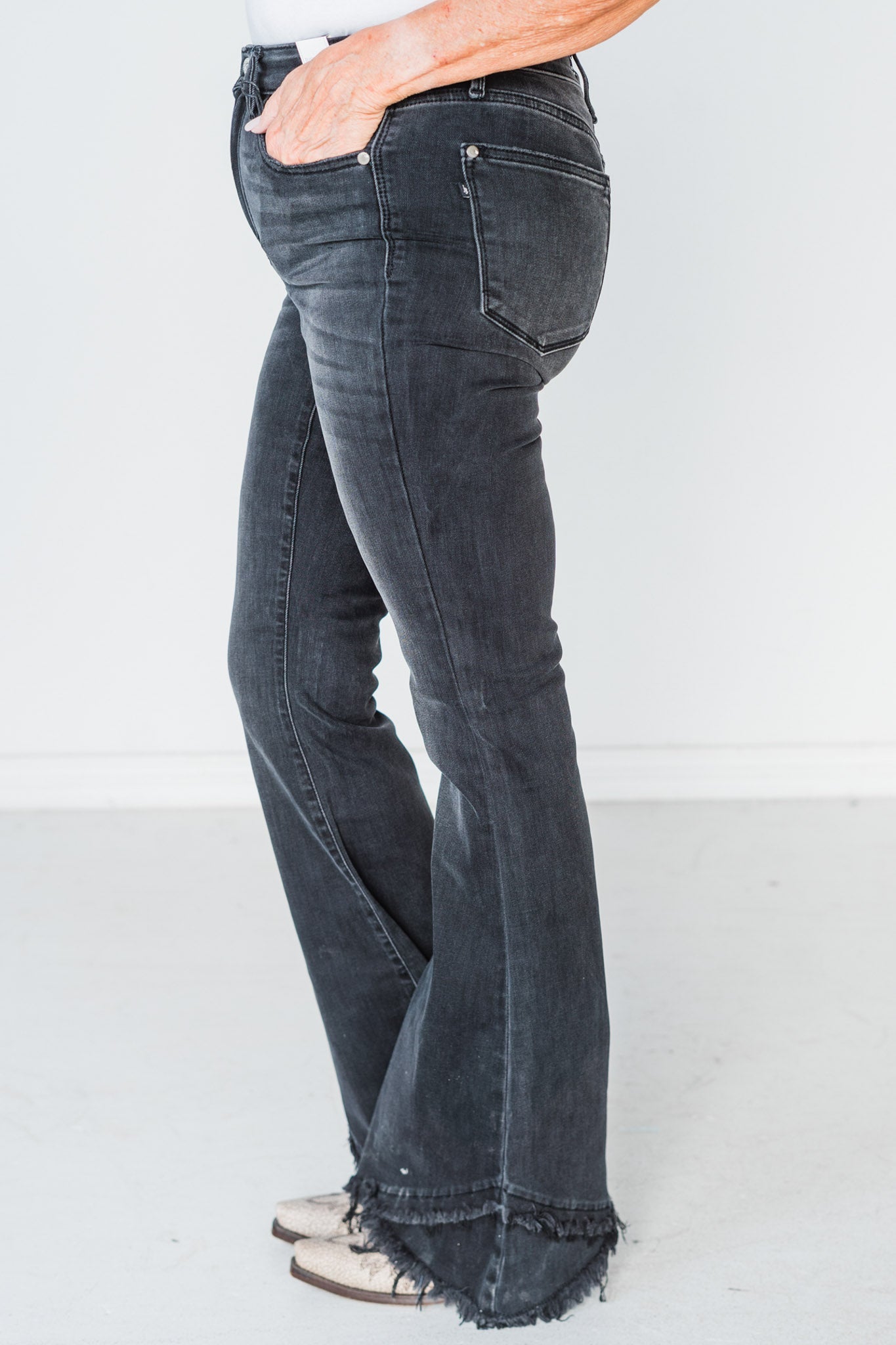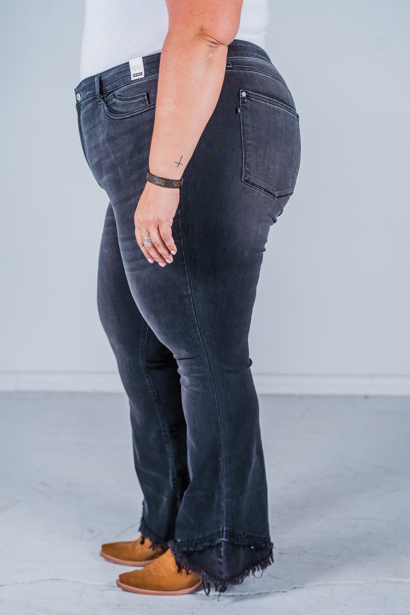 Who says black is boring? These Judy Blue Flare jeans are a statement piece with a twist. The mock fray tulip hem adds the perfect touch of edge to your outfit. Stand out from the crowd and be a trendsetter in these must-have jeans.