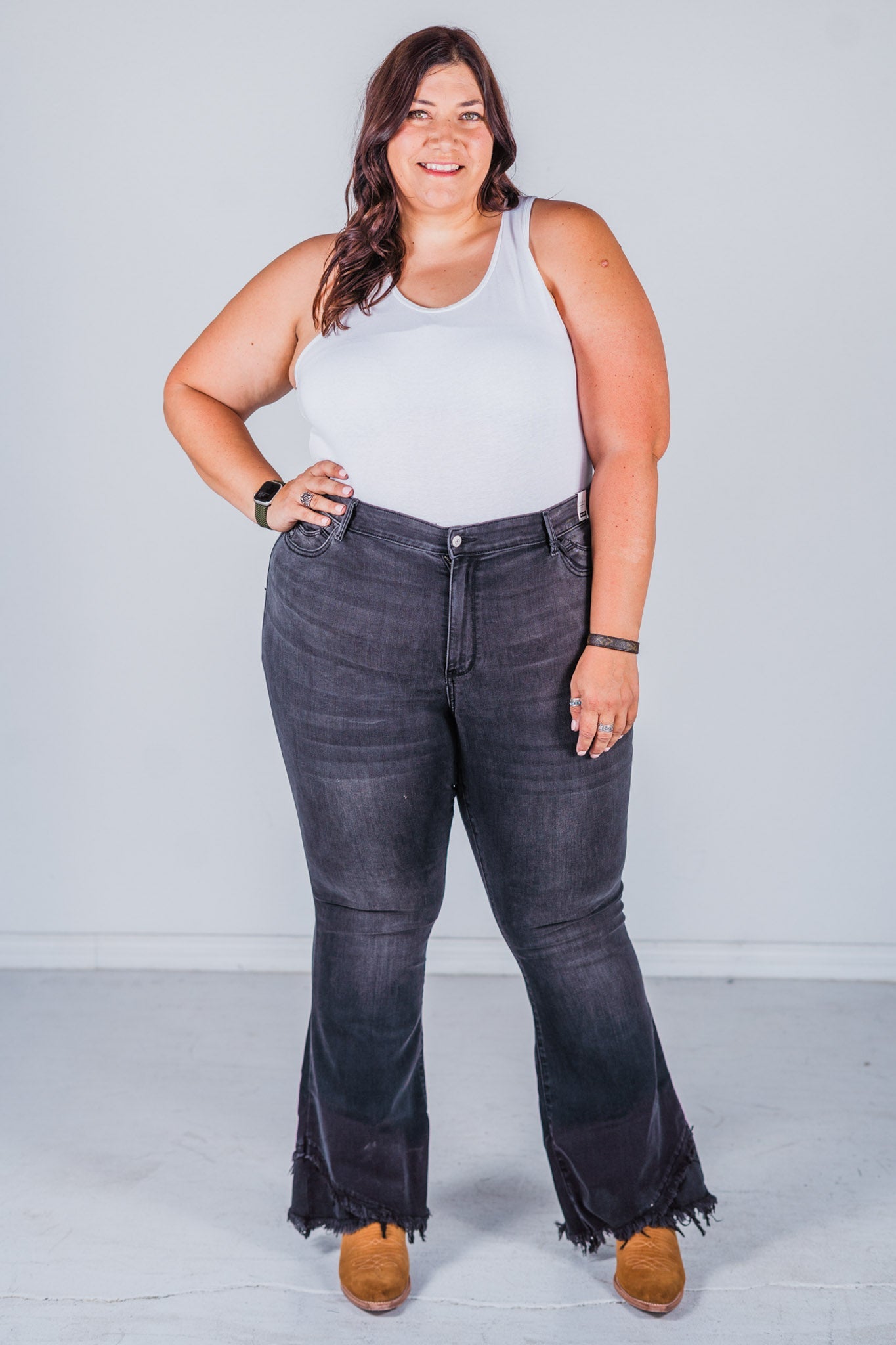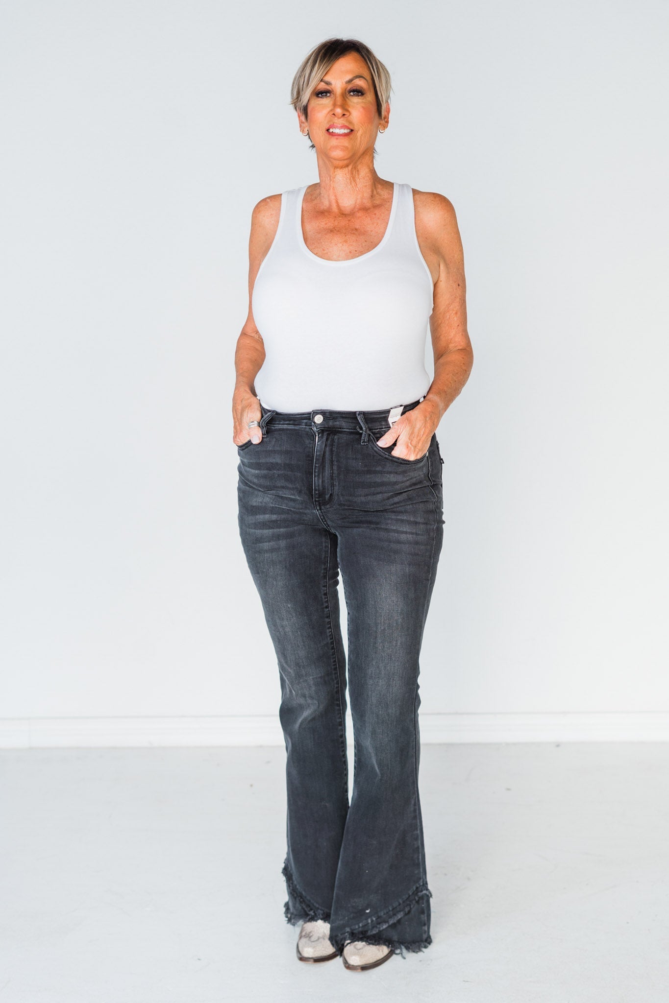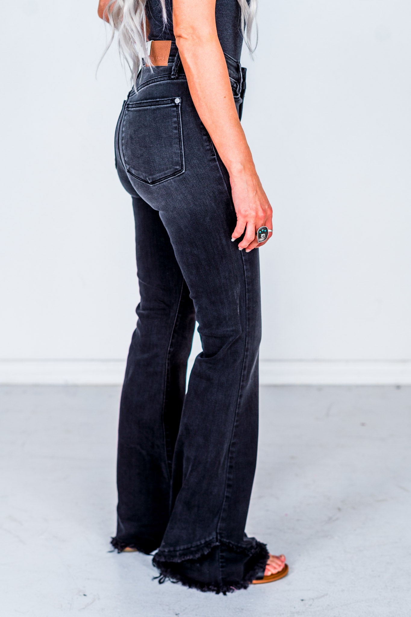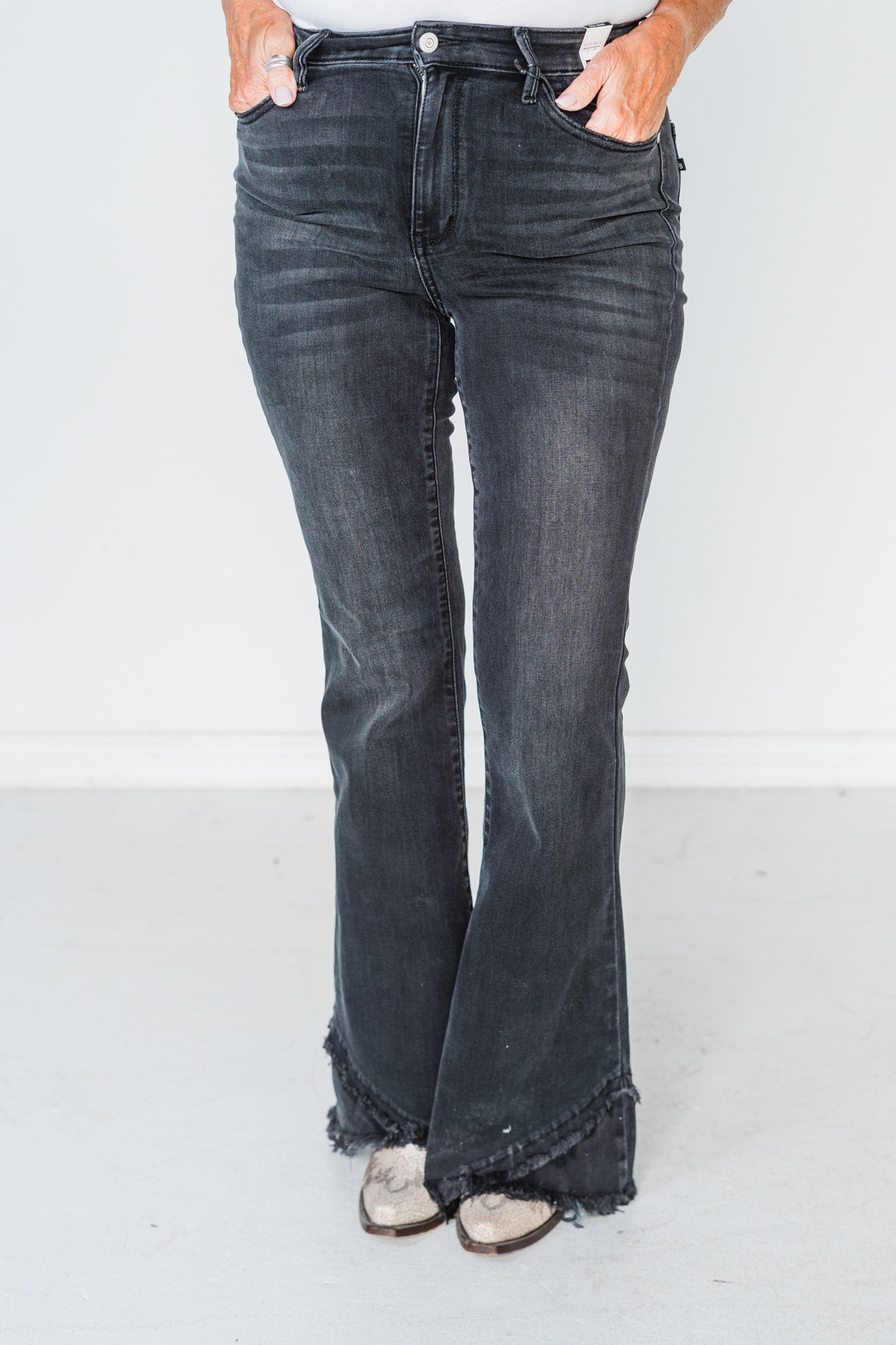 Who says black is boring? These Judy Blue Flare jeans are a statement piece with a twist. The mock fray tulip hem adds the perfect touch of edge to your outfit. Stand out from the crowd and be a trendsetter in these must-have jeans.