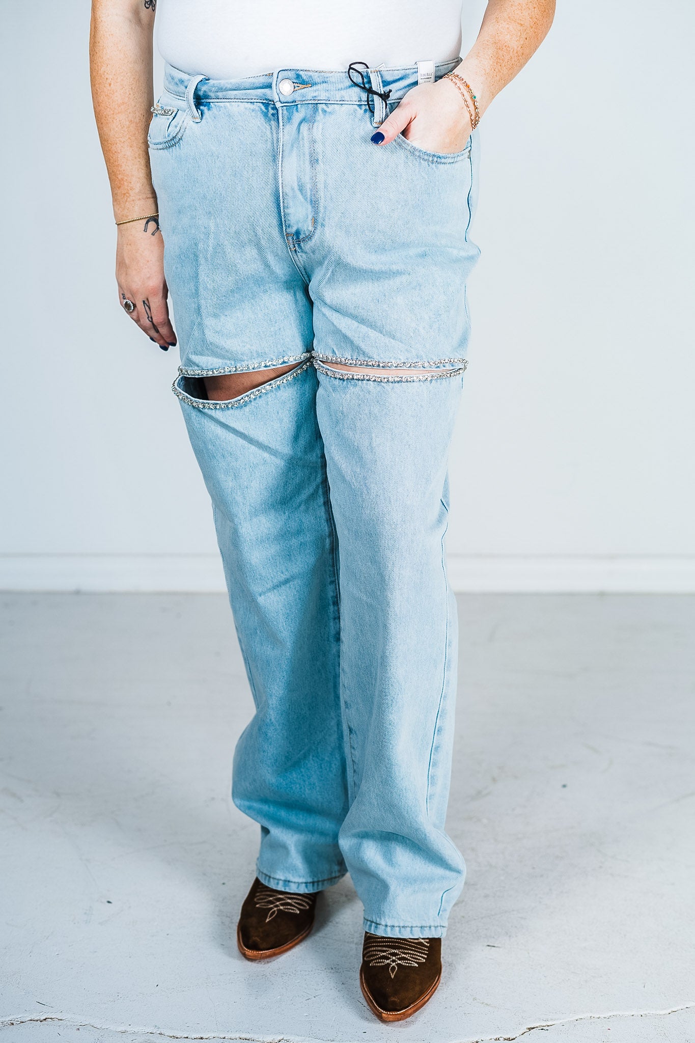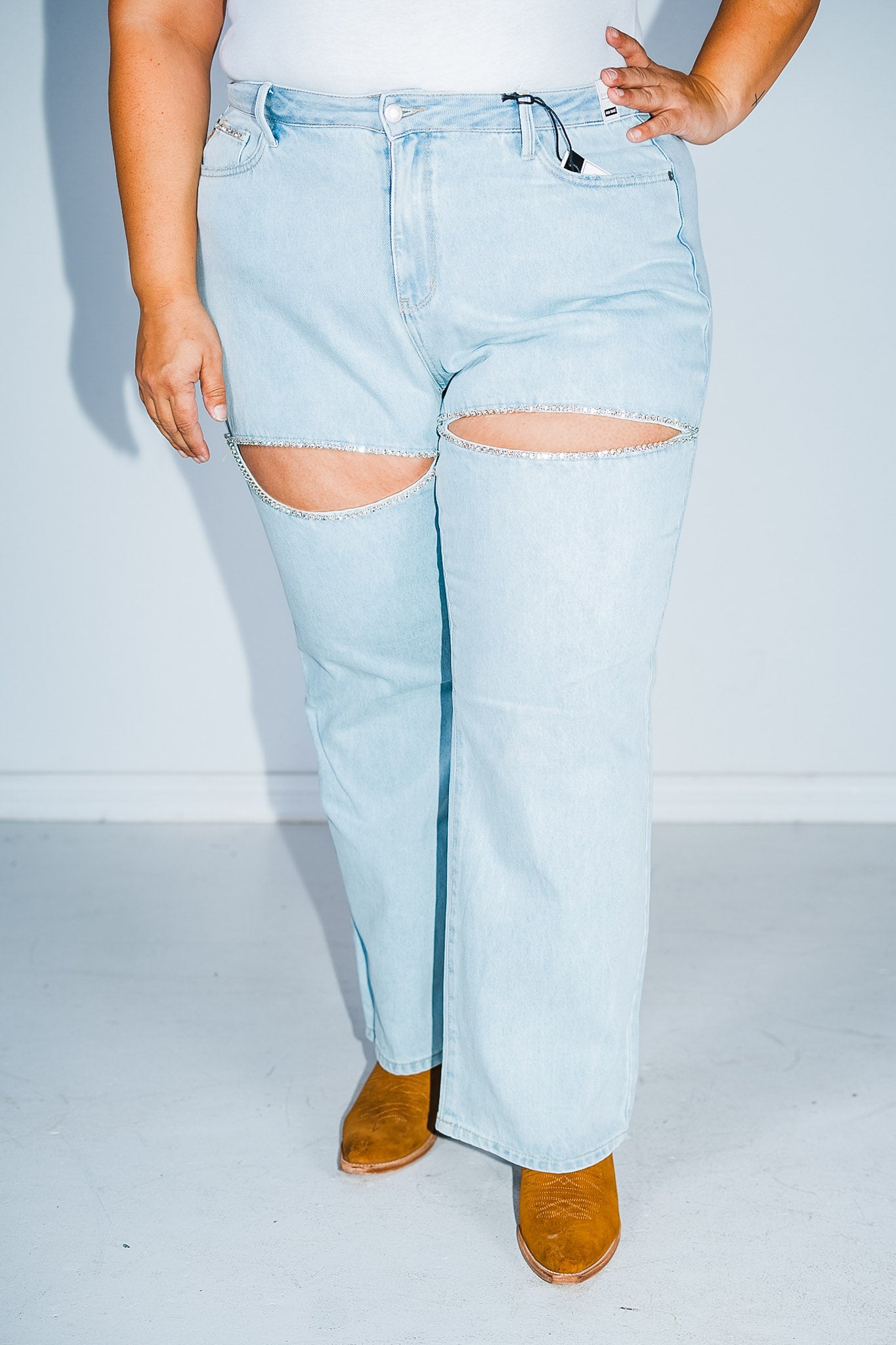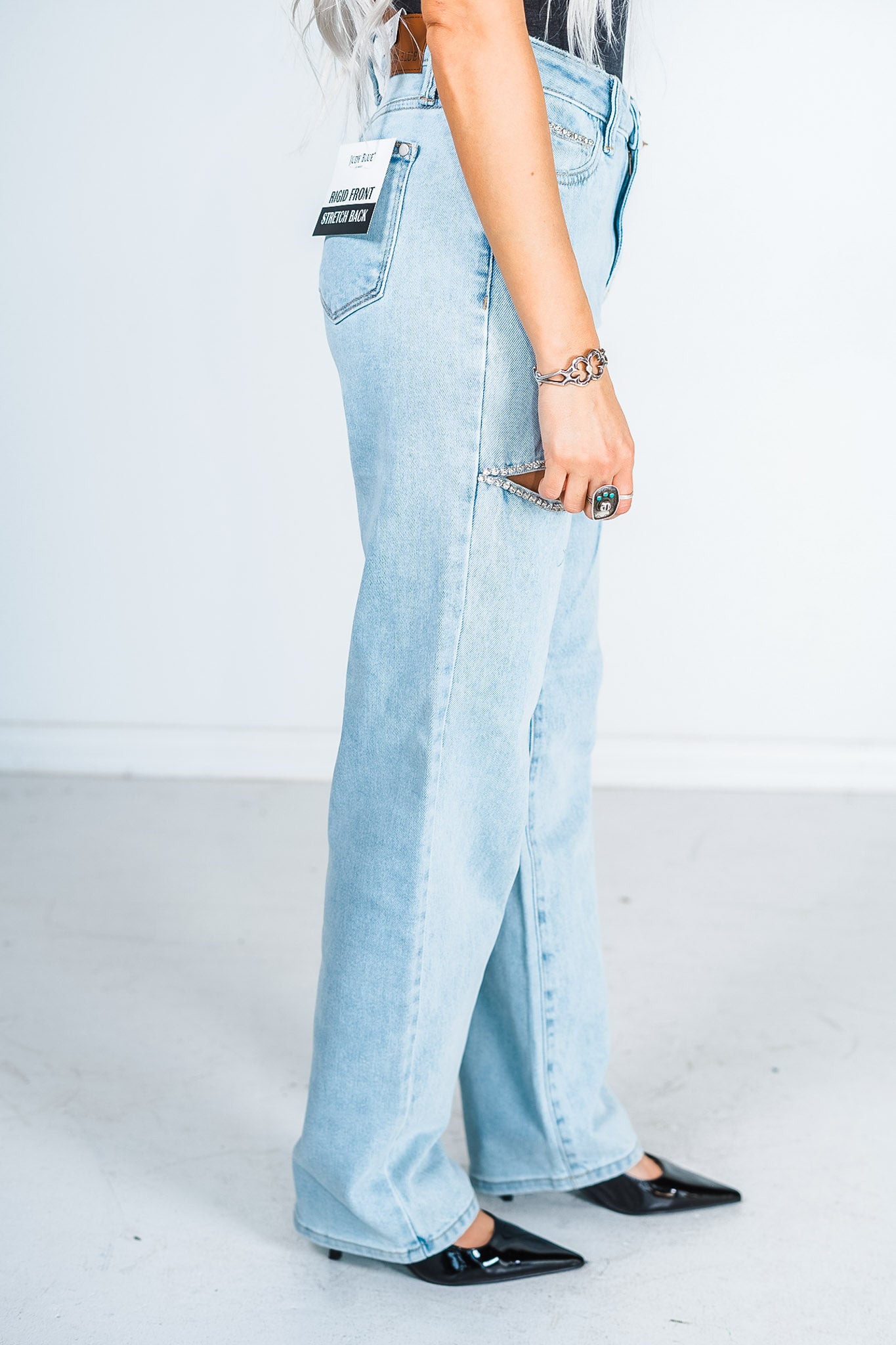 Add a little magic to your fashion game with these jeans! With a high waist and slit detail, it's the perfect combination of trendy and flirty. And let's not forget about the rhinestone accents for a touch of sparkle. These straight jeans are anything but basic - they're a must-have addition to your wardrobe!