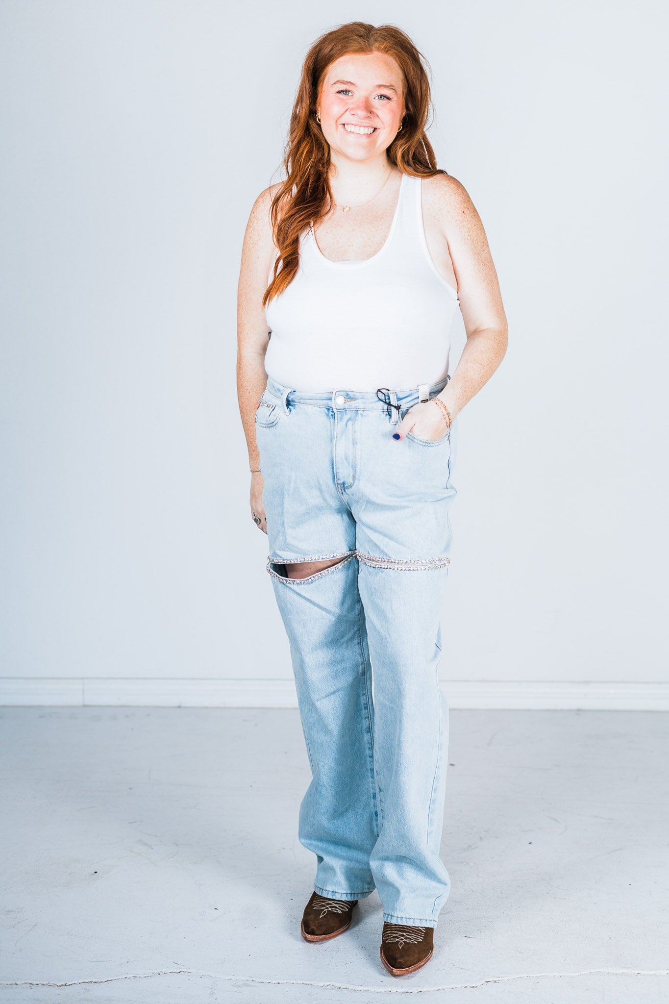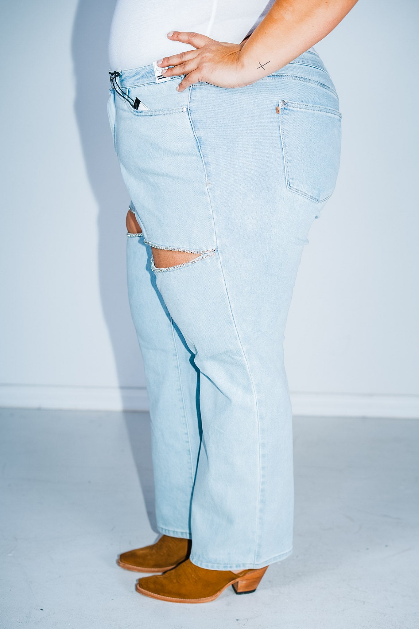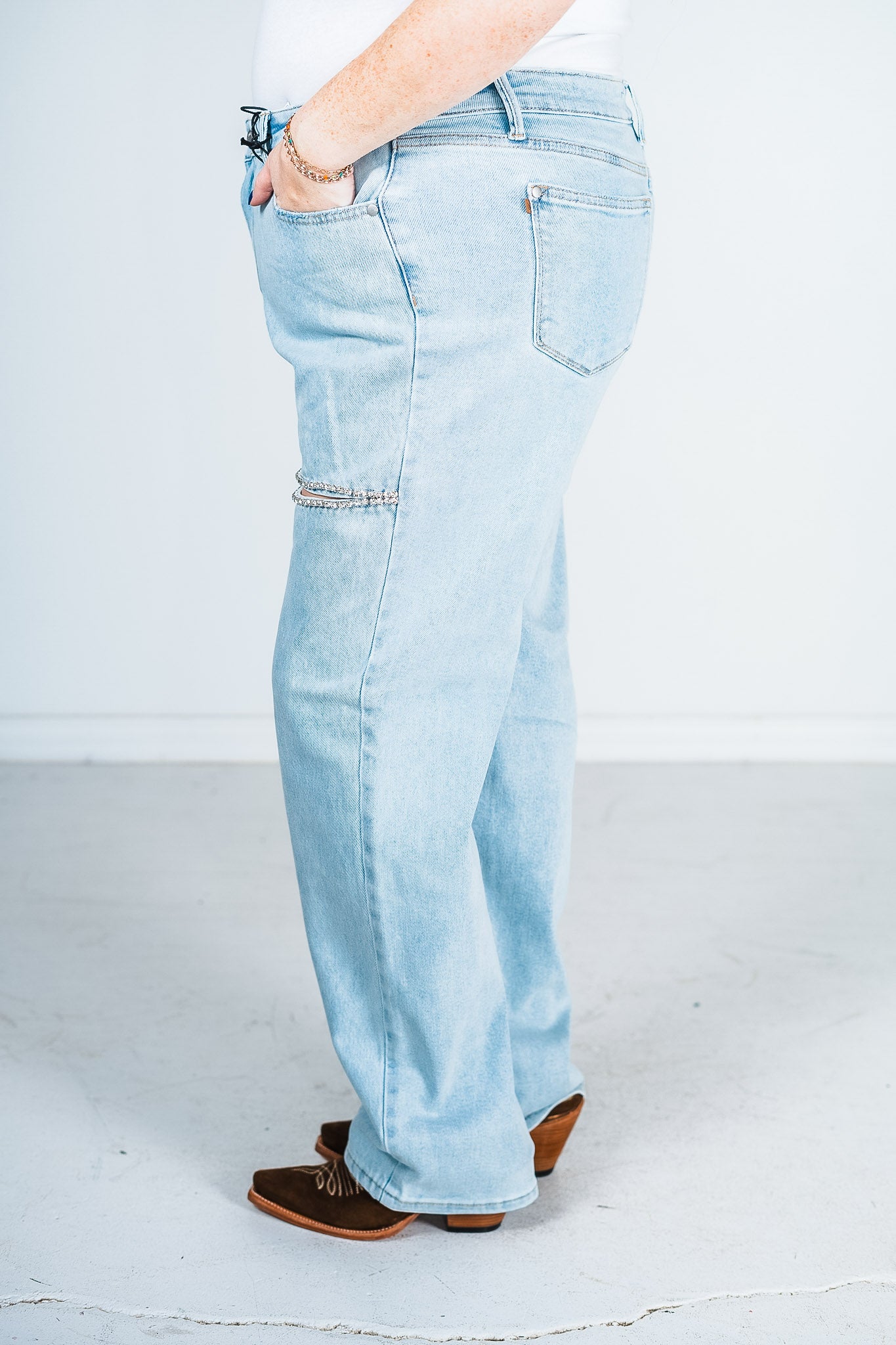 Add a little magic to your fashion game with these jeans! With a high waist and slit detail, it's the perfect combination of trendy and flirty. And let's not forget about the rhinestone accents for a touch of sparkle. These straight jeans are anything but basic - they're a must-have addition to your wardrobe!