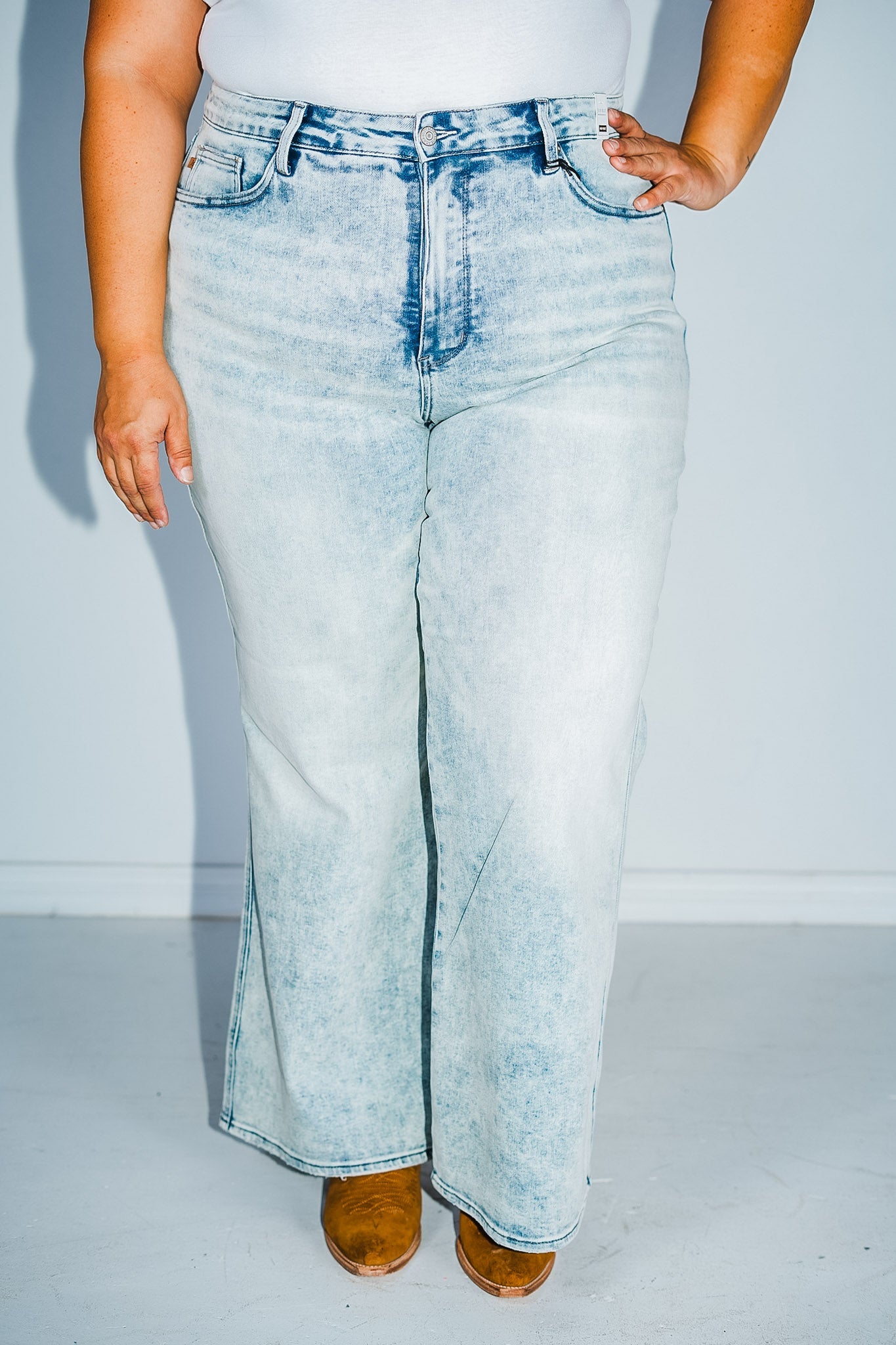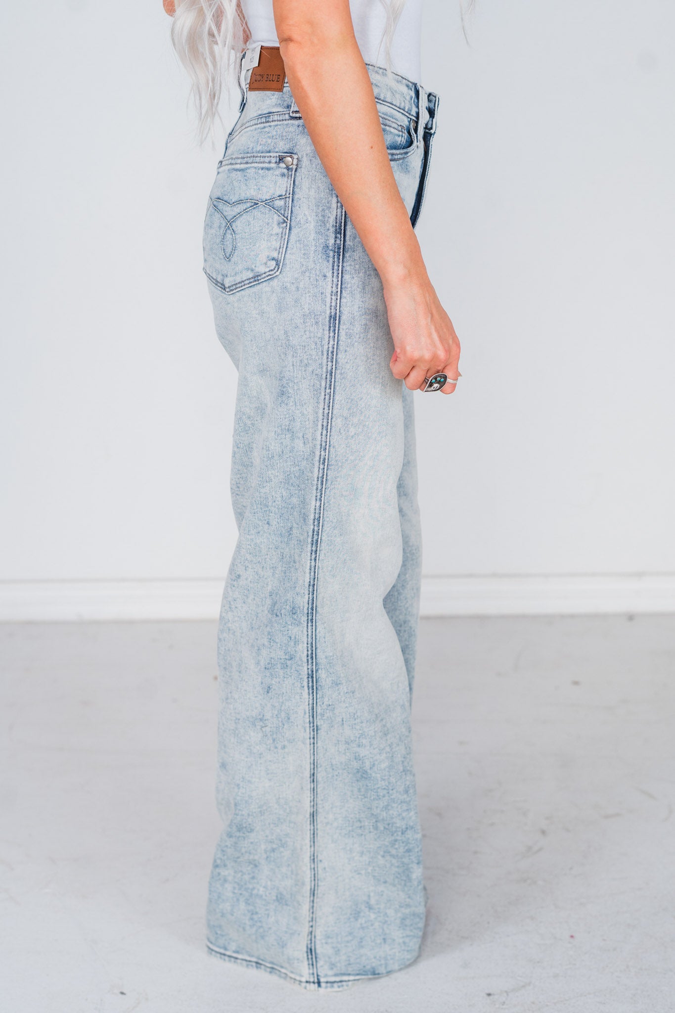 Upgrade your denim game with Judy Blue's Tummy Control Retro Wide Leg Light Wash Jeans. This high-waisted pair not only boasts a trendy retro style and light wash, but also features tummy control for a flattering fit. Comfortable and chic - the perfect addition to your wardrobe.