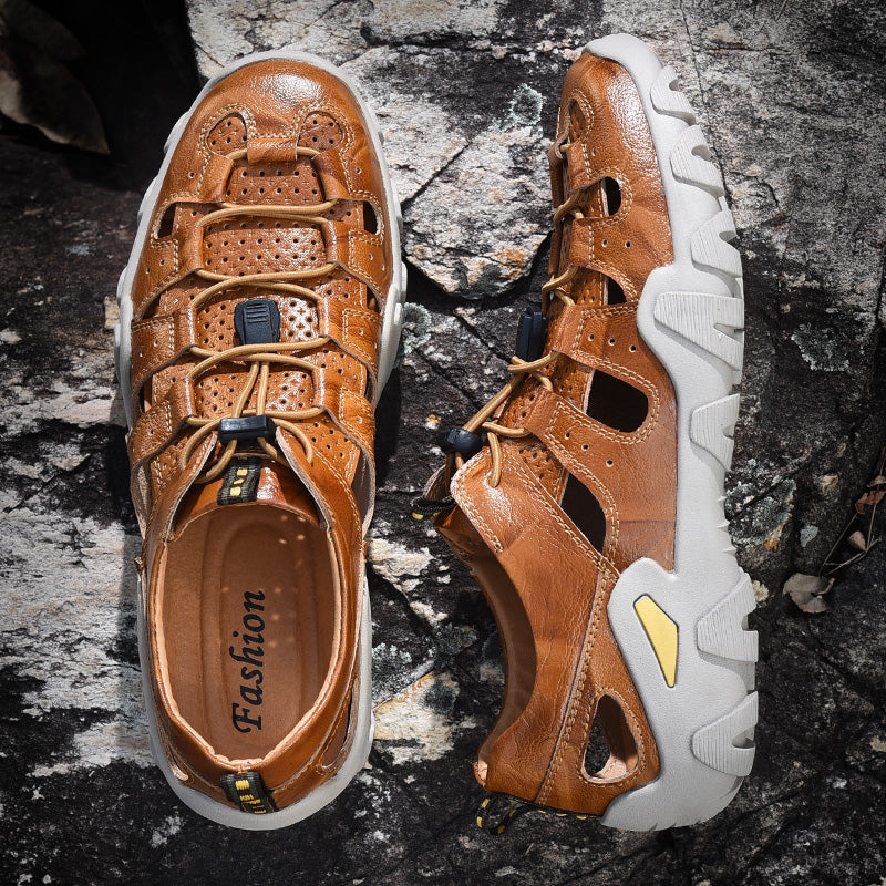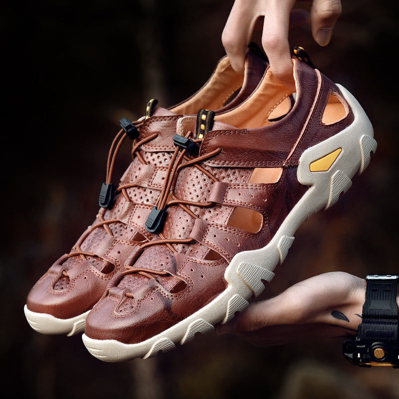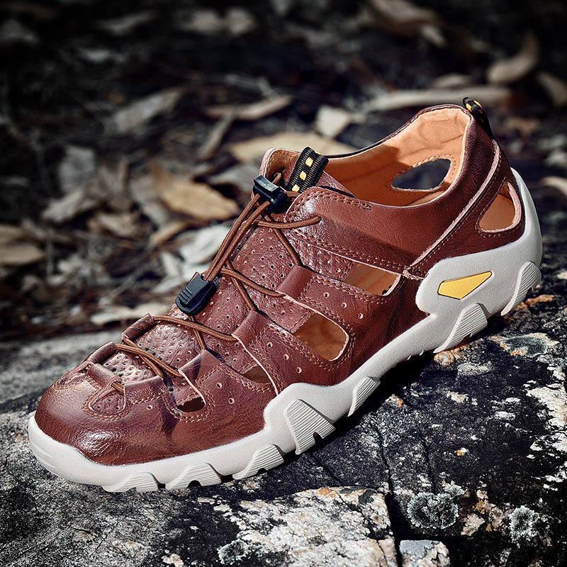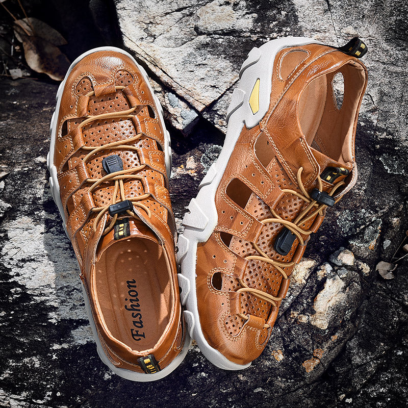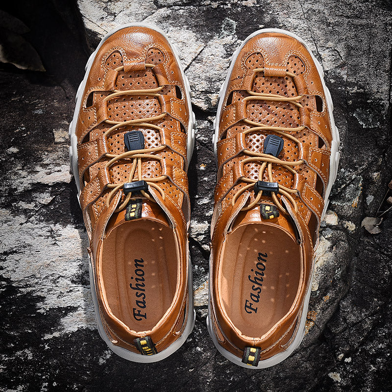 This pair of shoes is a perfect combination of leather and rubber. The upper is made of high-quality leather which is soft breathable and easy to maintain. The upper adopts a hollow design which can enhance breathability while ensuring foot protection. The hollow design can meet some outdoor needs. The need for wading for sports enthusiasts eliminates the need to walk barefoot when crossing a river or pond which also reduces the risk of accidental foot injury due to exposure.