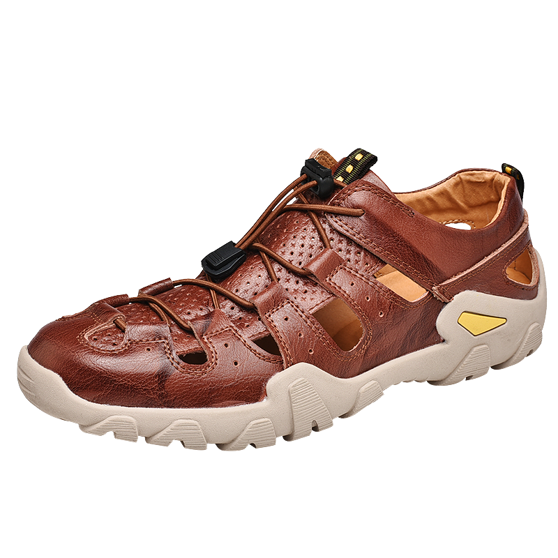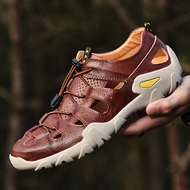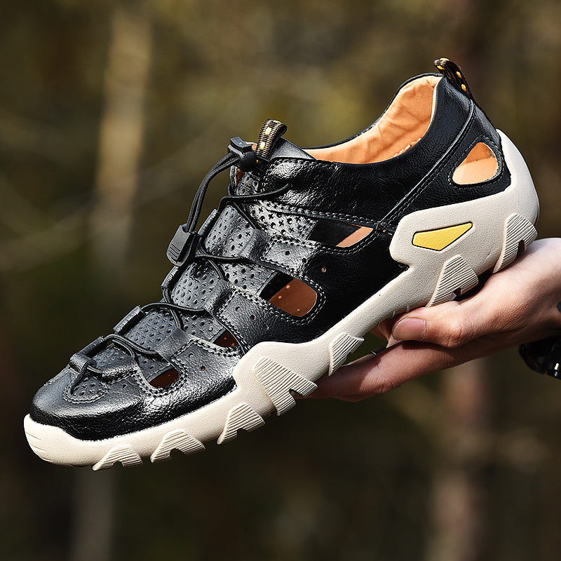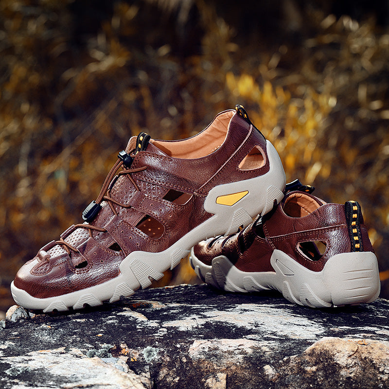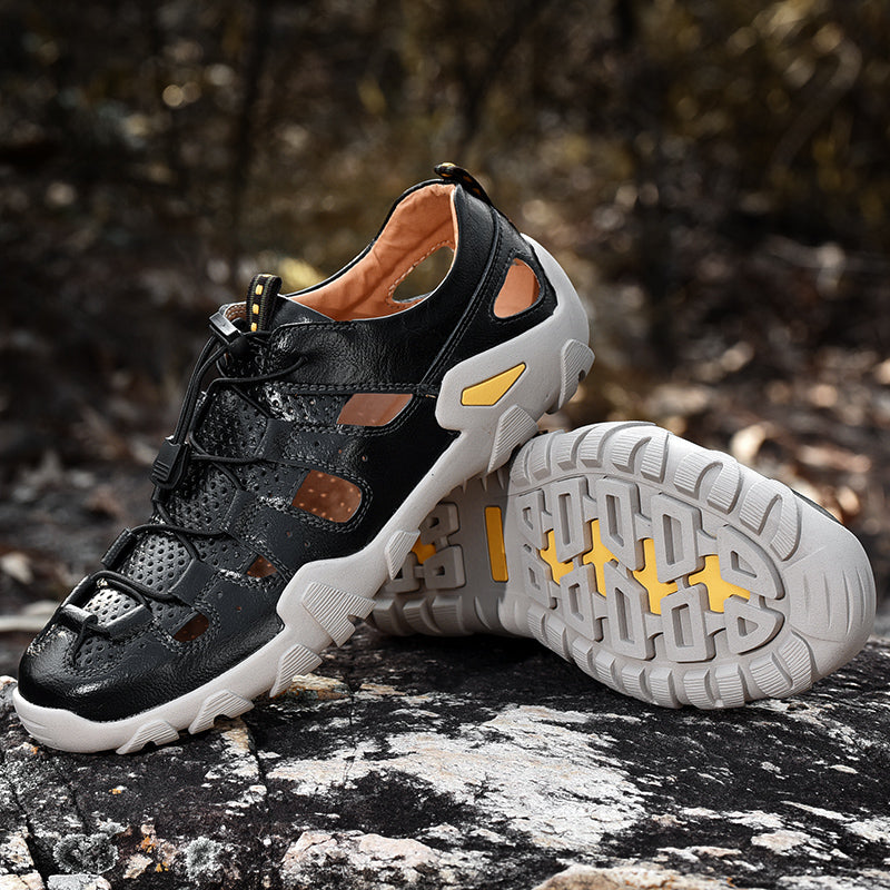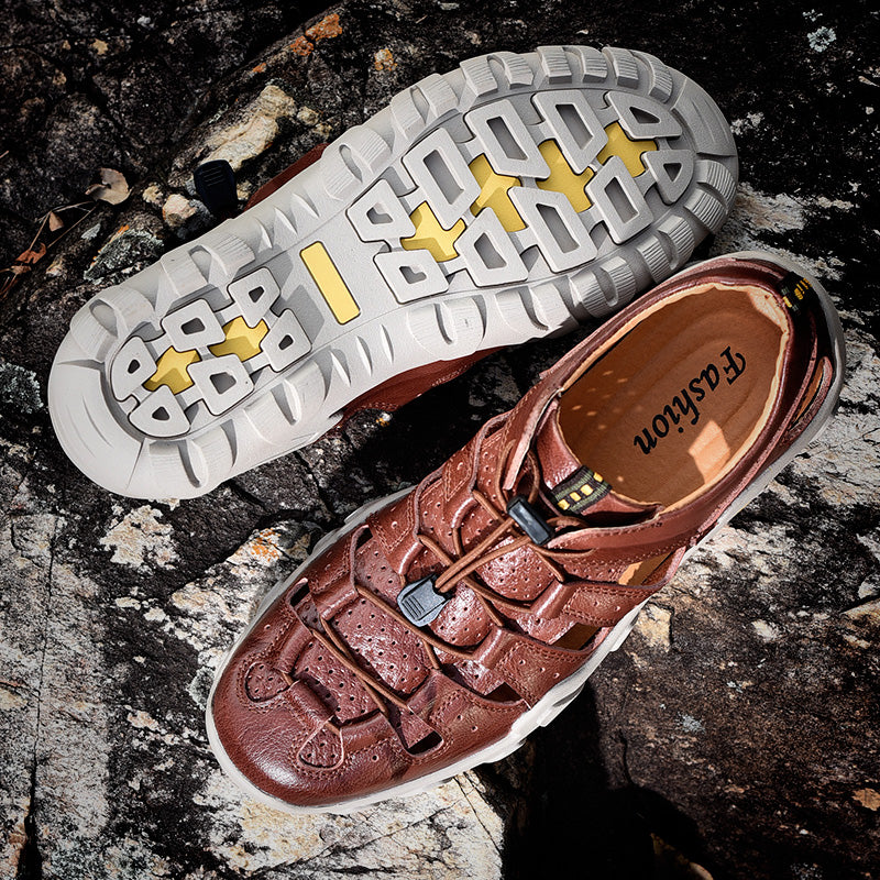 This pair of shoes is a perfect combination of leather and rubber. The upper is made of high-quality leather which is soft breathable and easy to maintain. The upper adopts a hollow design which can enhance breathability while ensuring foot protection. The hollow design can meet some outdoor needs. The need for wading for sports enthusiasts eliminates the need to walk barefoot when crossing a river or pond which also reduces the risk of accidental foot injury due to exposure.