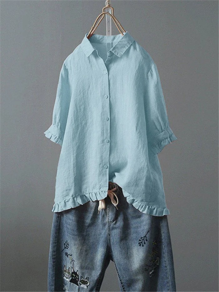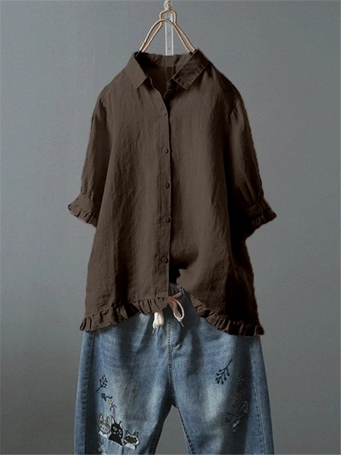 Solid Casual 3/4 Sleeve Turn-down Collar Tops
