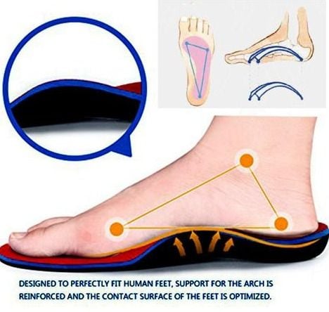The premium orthotic insoles, featuring anatomical arch support help improve foot and leg alignment, enhancing comfort and easing stress and pain on the heel.