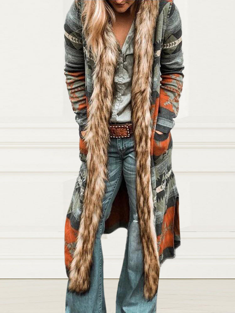 Western Style Retro Fur Collar Long Cardigan Jacket