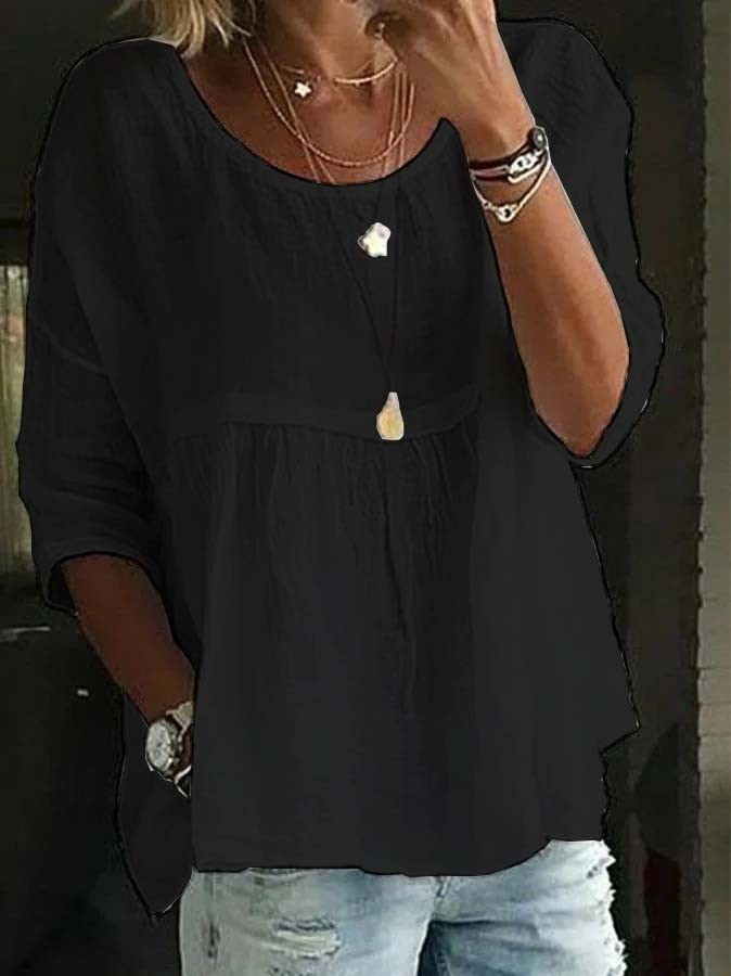 Women's Casual Cotton Linen Round Neck Long Sleeve T-Shirt