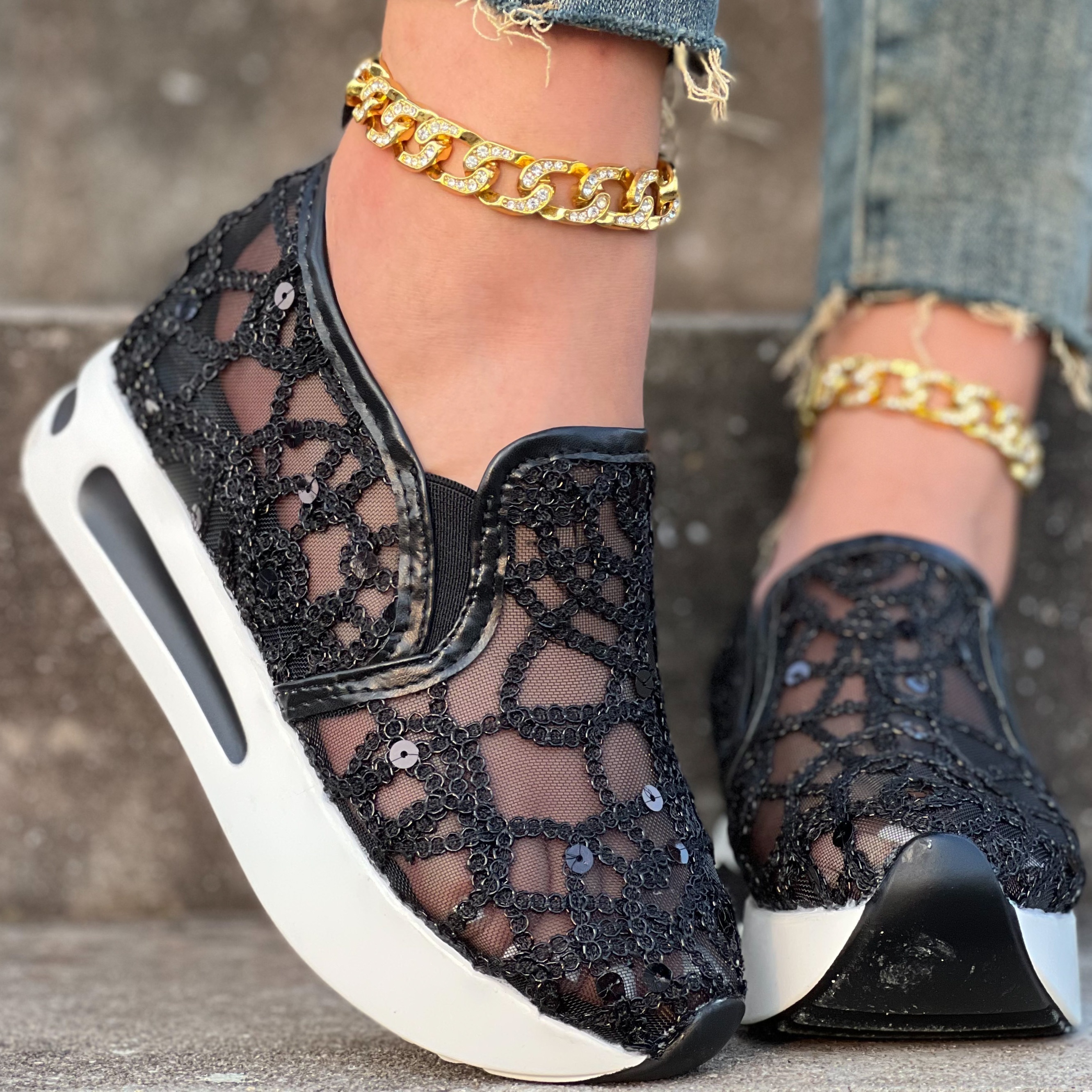 Women's Glitter Sequins Decor Sneakers, Breathable Mesh Inner Wedge Heeled Shoes, Comfortable Platform Shoes
