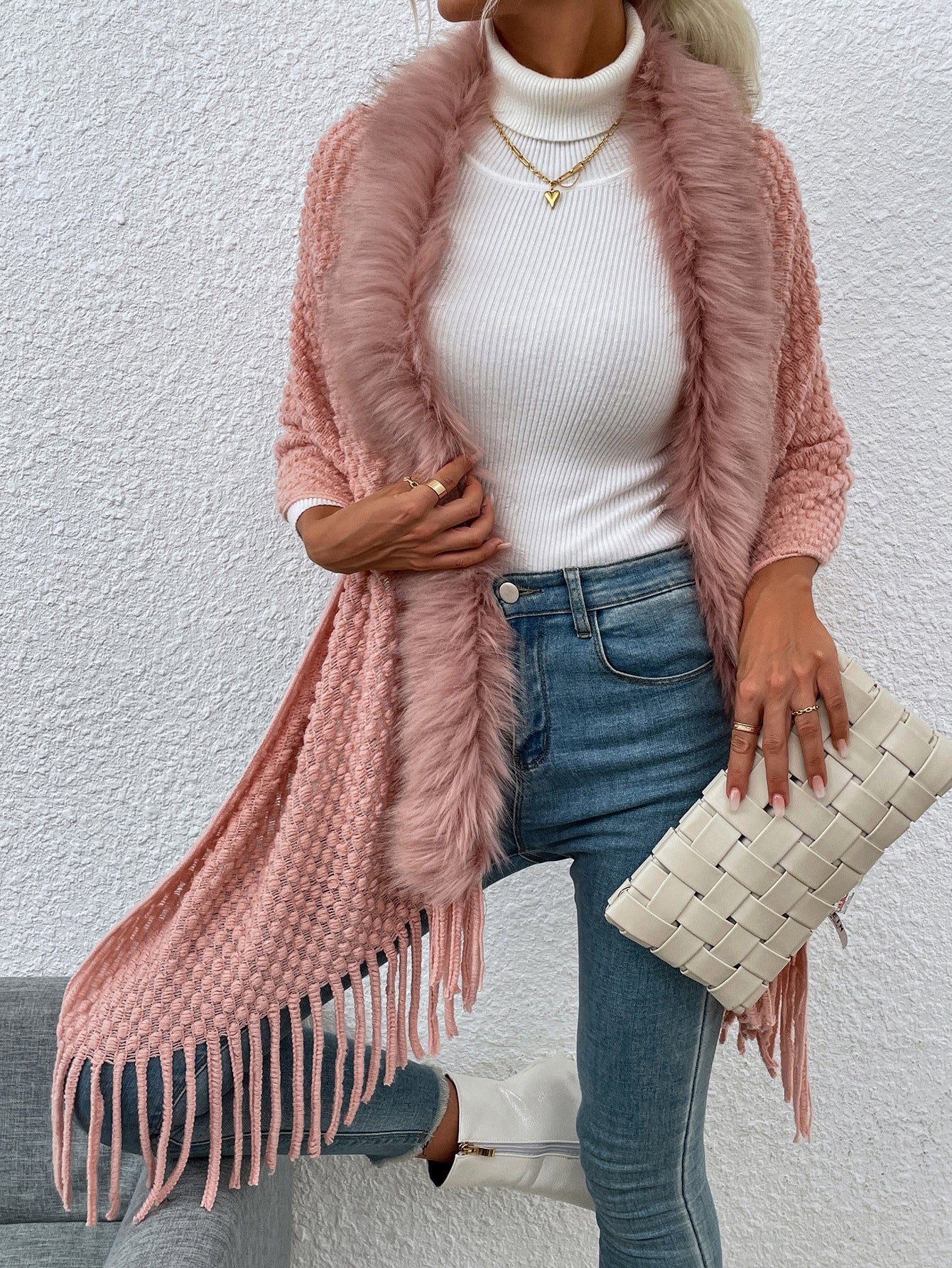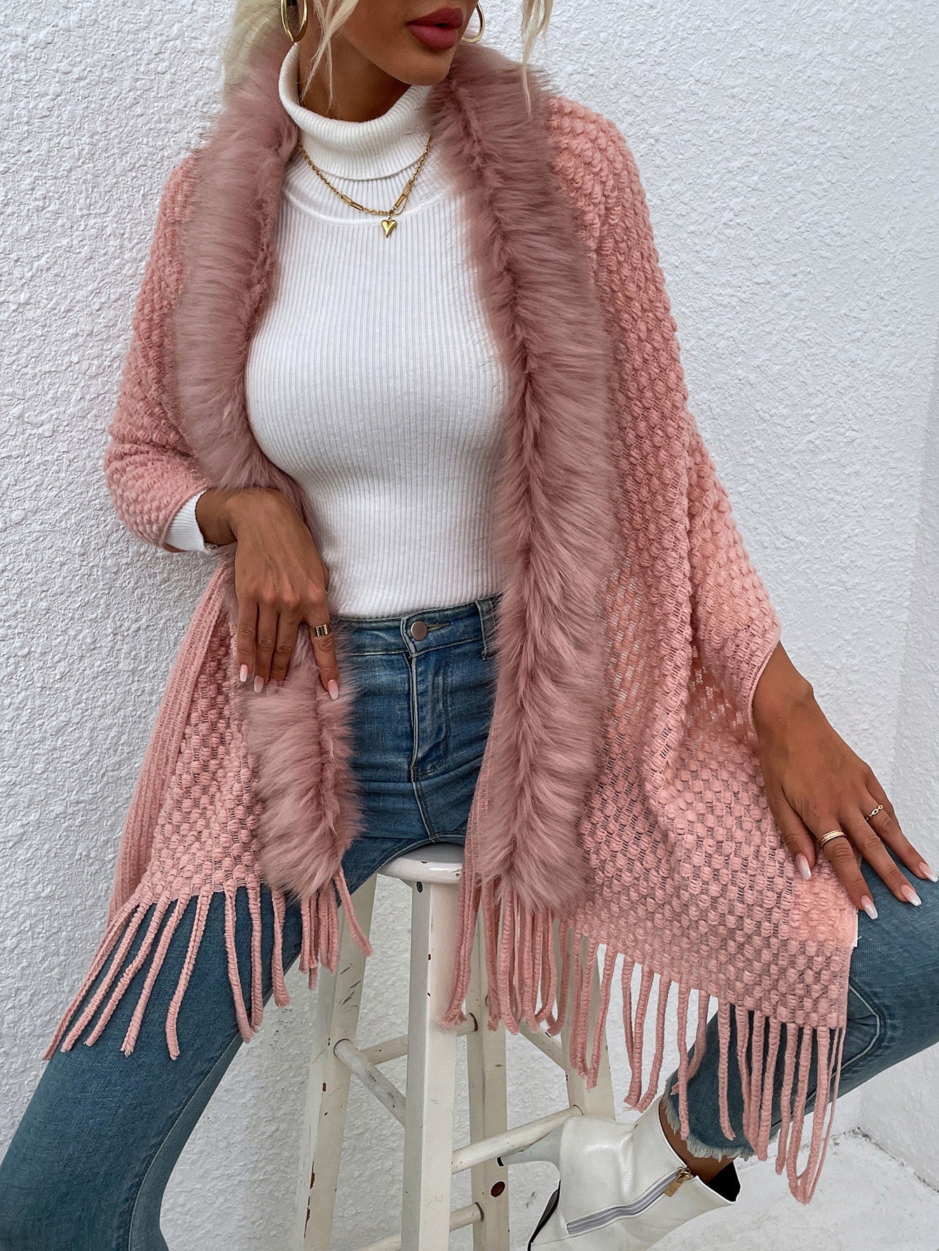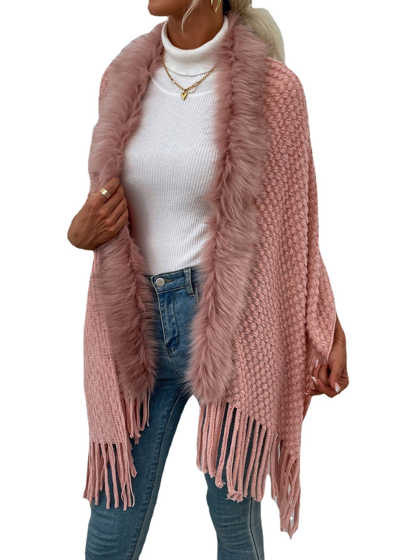 Women's Luxury Fur Collar Fringed Shawl Sweater Coat