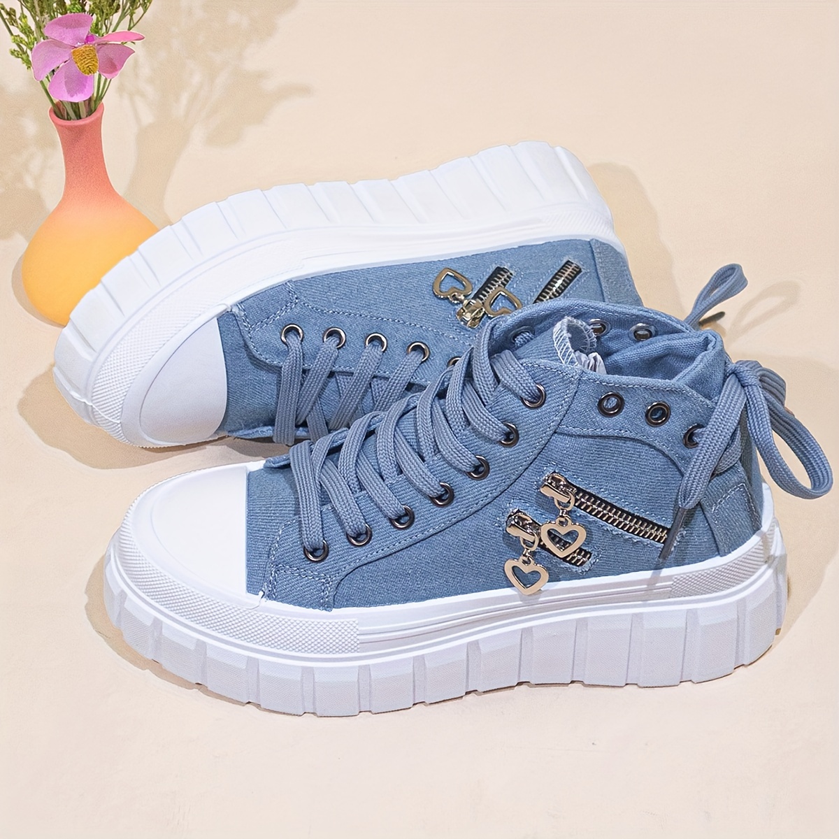 Women's Solid Color Sneakers, Lace Up Comfy Platform Heart Zipper Skate Shoes, Lightweight Low-top Canvas Shoes