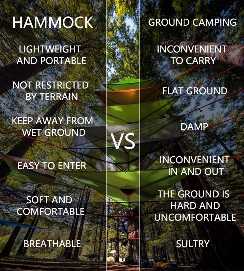 No Level-Ground Needed: The hammock is suspended off the ground between 3 anchor points and so there’s no need to find level ground. Being held above the ground moves you away from damp, uneven, or stick/stone-covered ground.