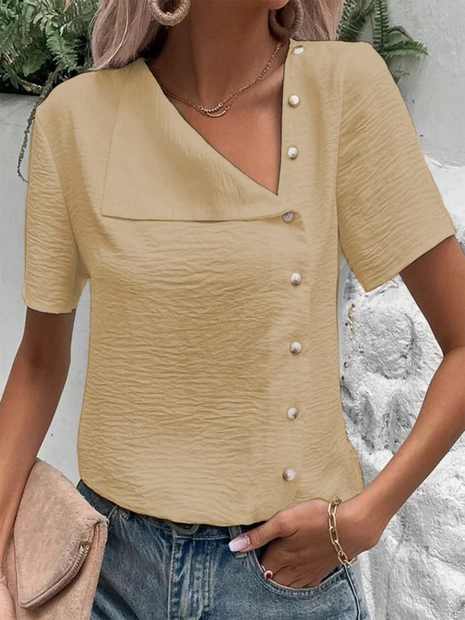 Plain Short Sleeve Buckle Casual Blouse