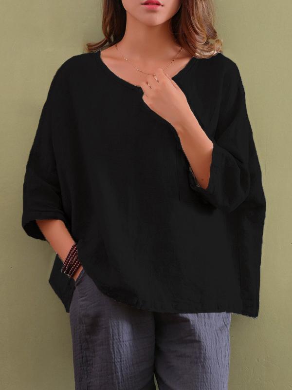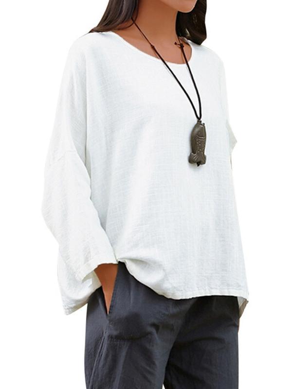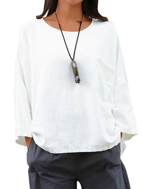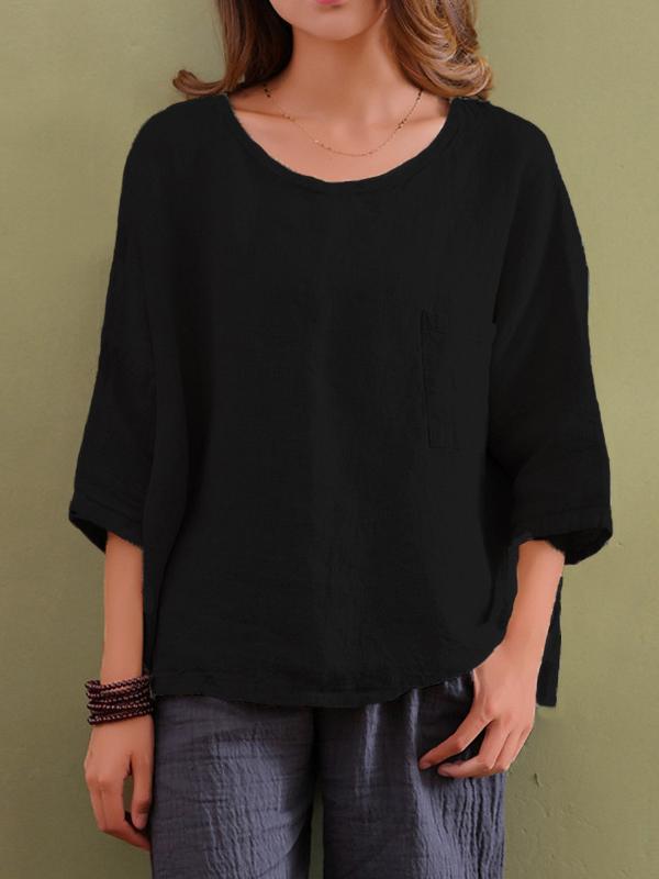 Plus Size Women's Casual Cotton And Linen Loose Round Neck Three-quarter Sleeve Solid Color Tee