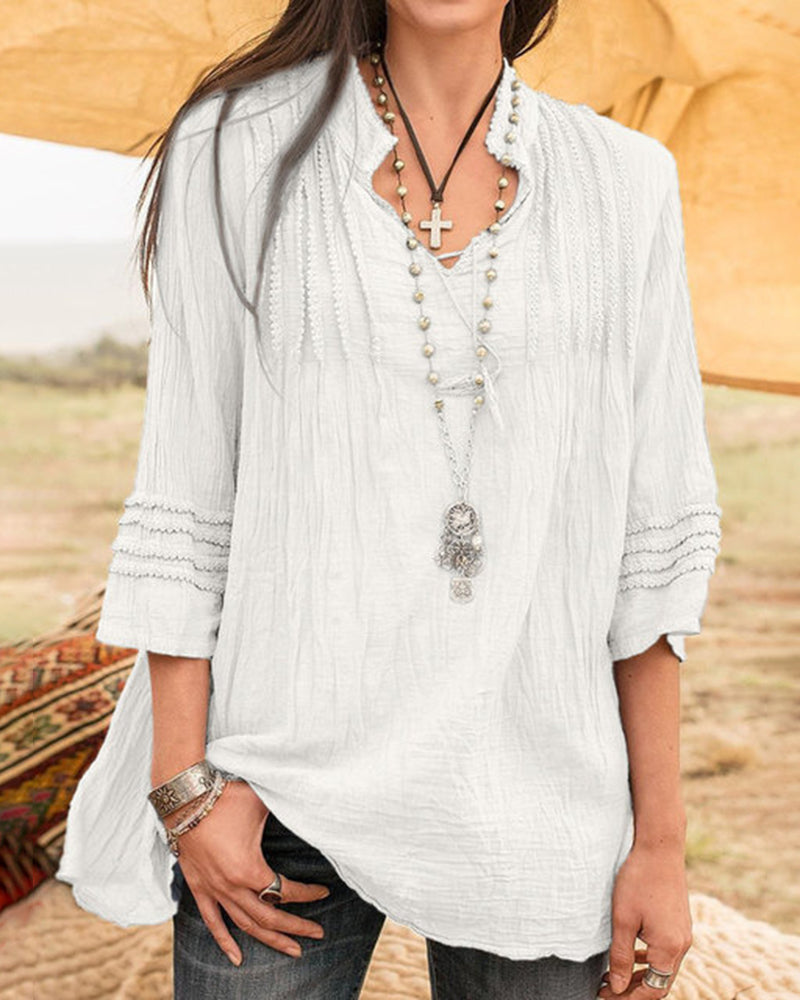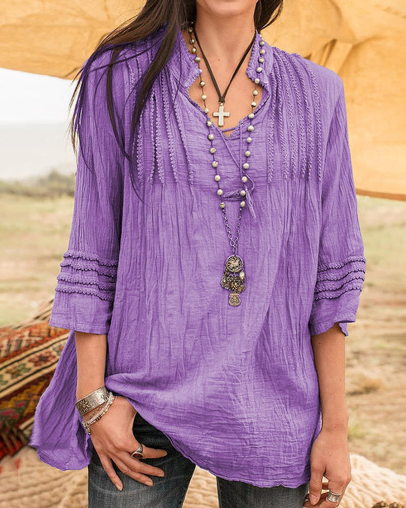 Solid V-Neck Tees Lace Splicing Fold Blouse Flowy Casual Loose Fit Shirt