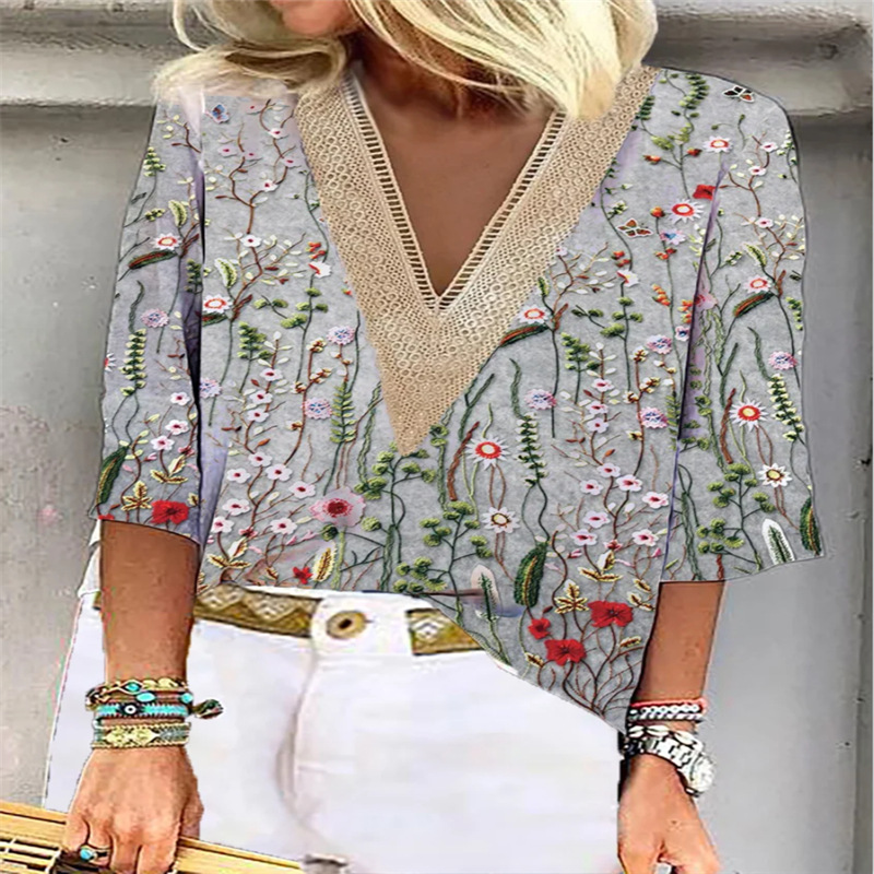 Summer Hot Sale Lace Edge V-neck Casual Printed Shirt for Women