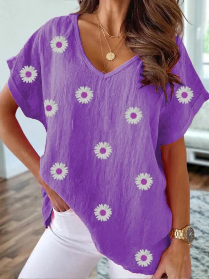 Summer Vintage Crumpled Daisy Loose-Fitting Casual T-shirt Short Sleeve
