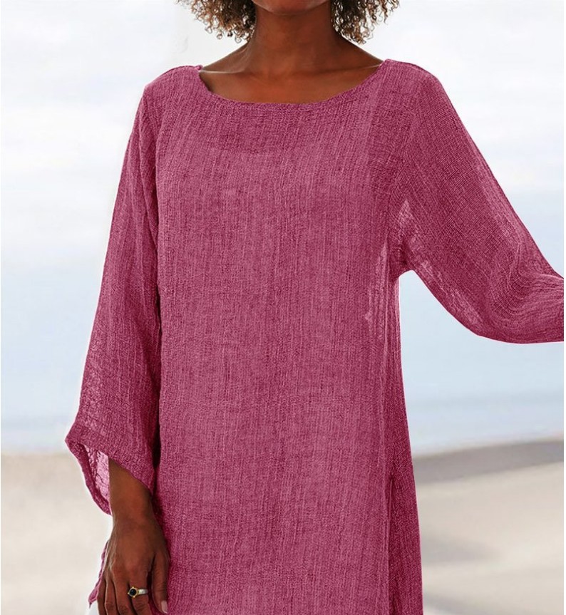 Women's Cotton Linen Fashion Simple Solid Color Irregular Hem Round Neck Long Sleeve Top