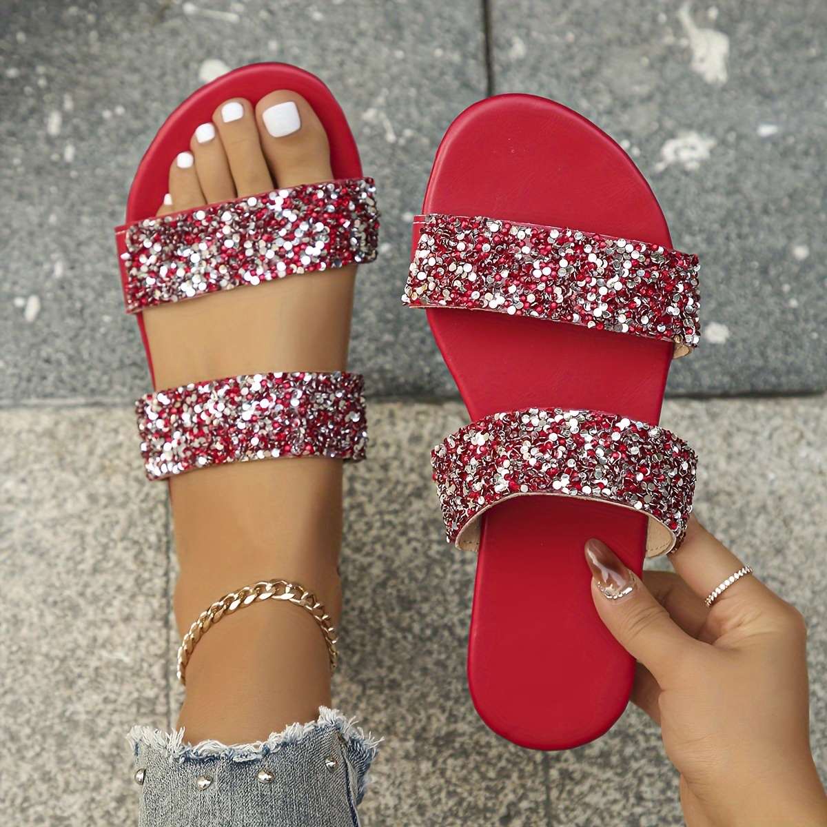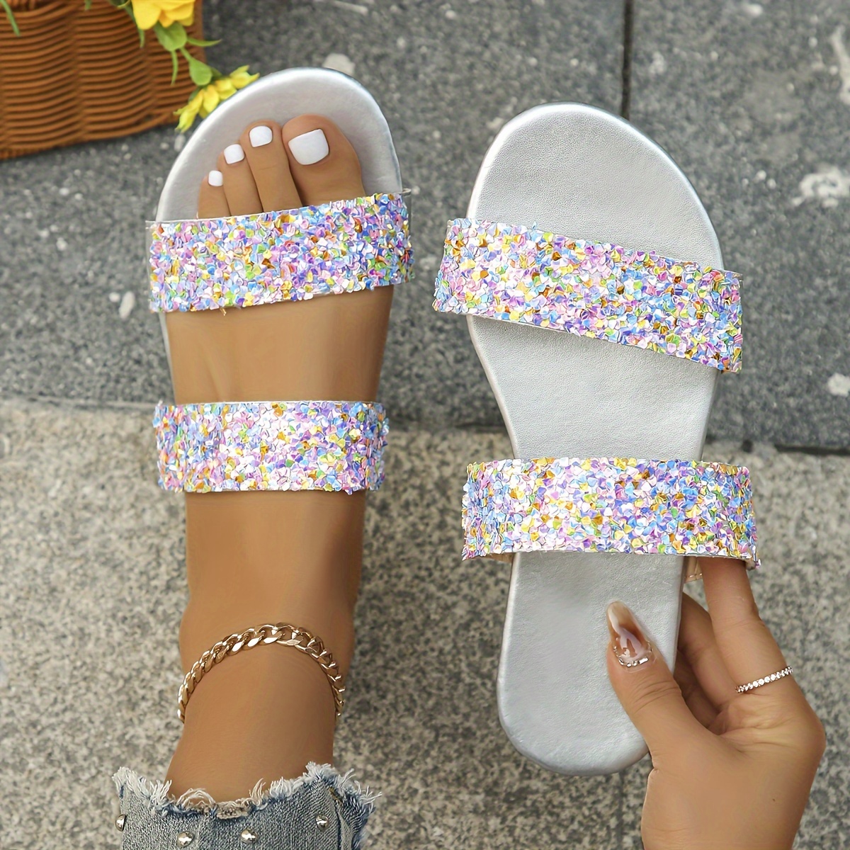 Women's Glitter Sequins Decor Slide Sandals, Casual Slip On Flat Summer Shoes, Lightweight Beach Shoes